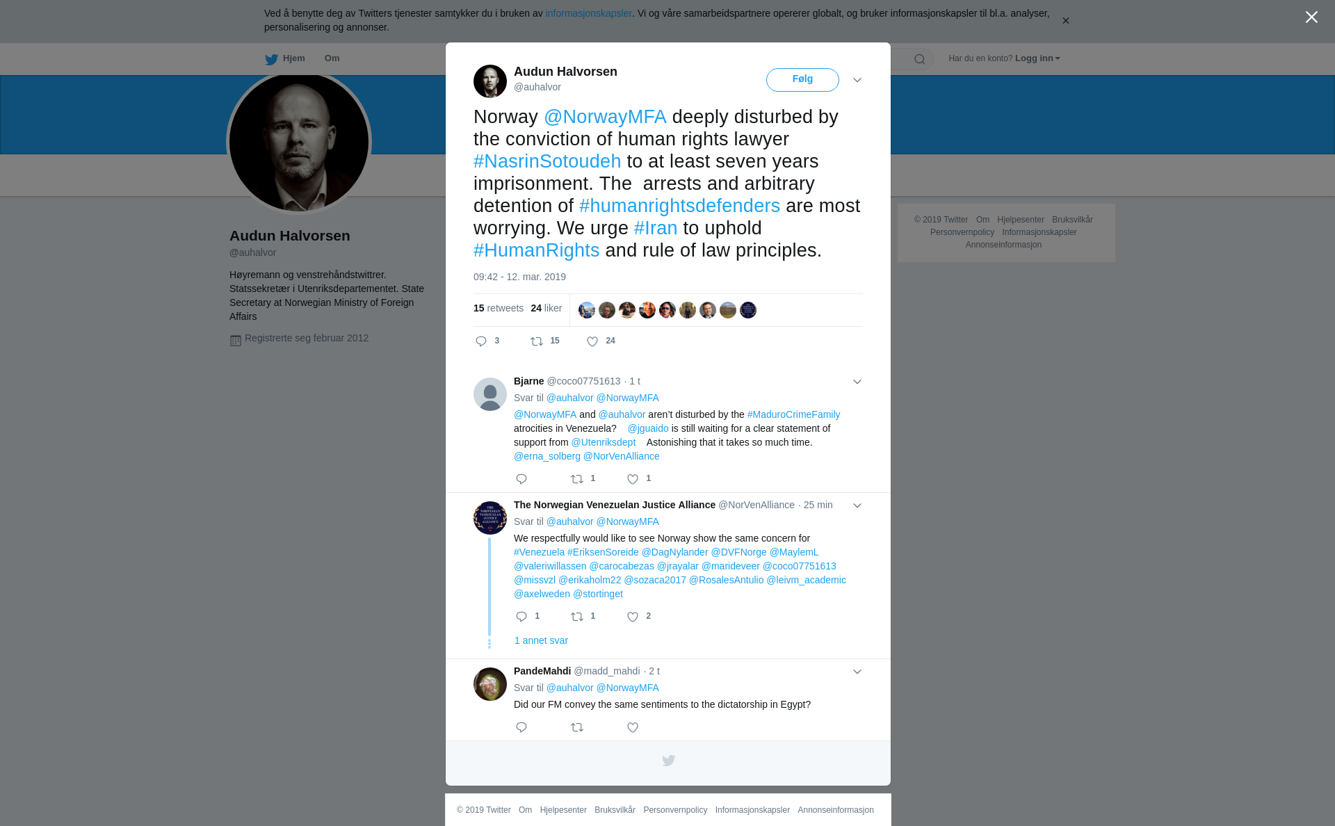 RT @auhalvor: Norway @NorwayMFA deeply disturbed by the conviction of human rights lawyer #NasrinSotoudeh to at least seven years imprisonment. The arrests and arbitrary detention of #humanrightsdefenders are most worrying. We urge #Iran to uphold #HumanRights and rule of law principles.