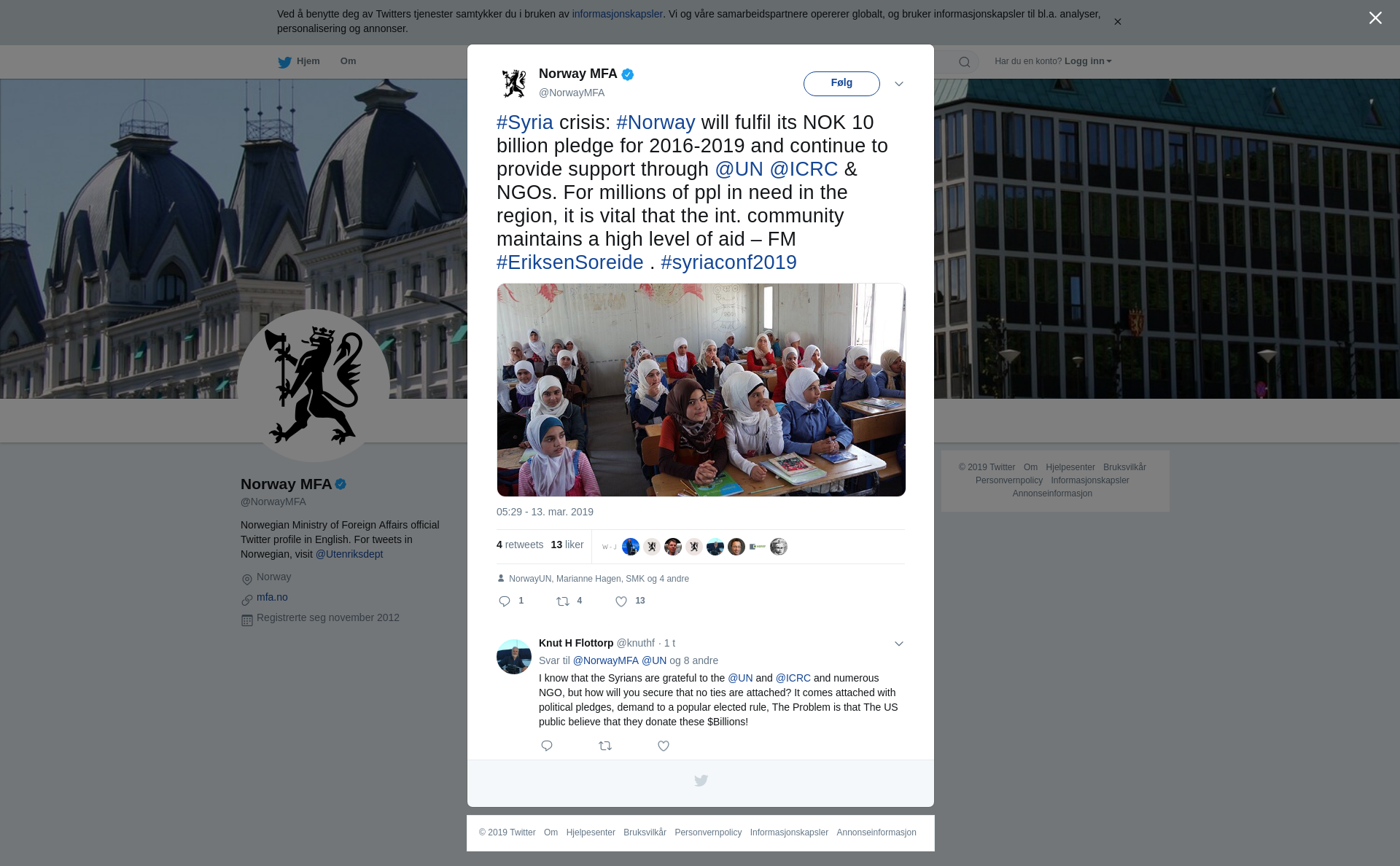 #Syria crisis: #Norway will fulfil its NOK 10 billion pledge for 2016-2019 and continue to provide support through @UN @ICRC & NGOs. For millions of ppl in need in the region, it is vital that the int. community maintains a high level of aid – FM #EriksenSoreide . #syriaconf2019 https://t.co/RtM7rxvqGj