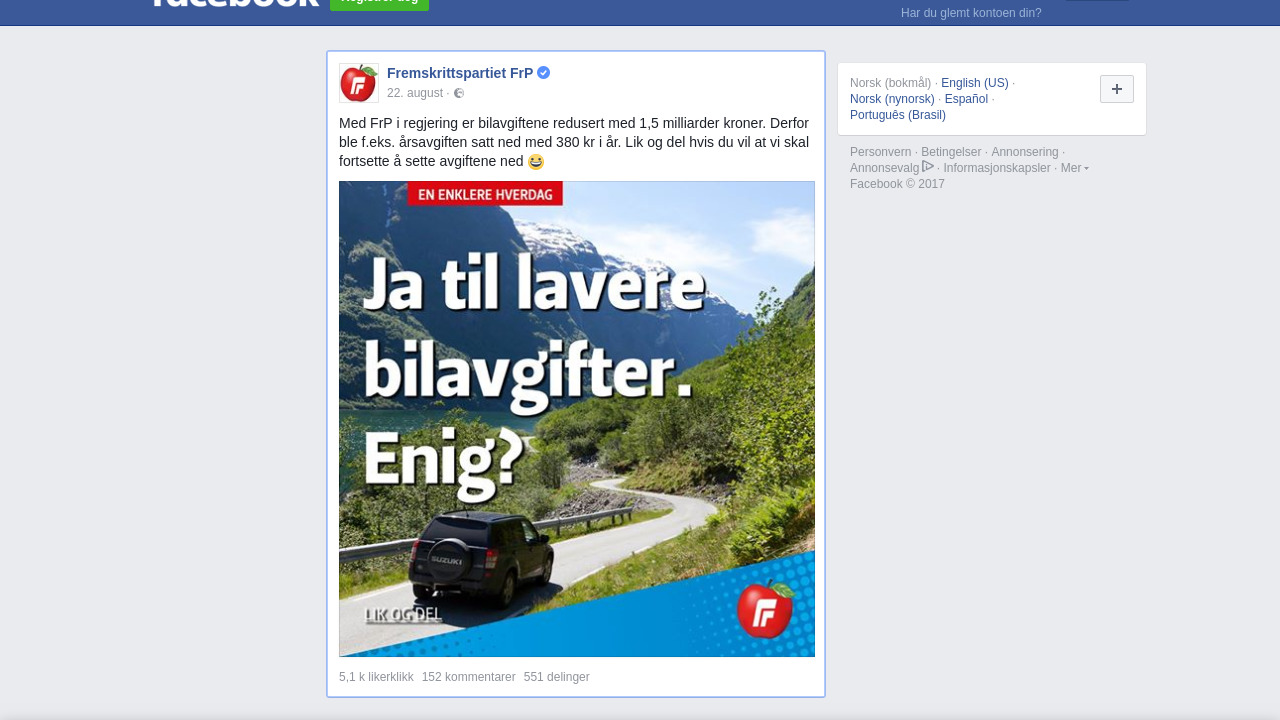 Med FrP i regjering er bilavgiftene redusert med 1,5 milliarder kroner. Derfor ble f.eks. årsavgiften satt ned med 380 kr i år. Lik og del hvis du vil at vi skal fortsette å sette avgiftene ned 😀
