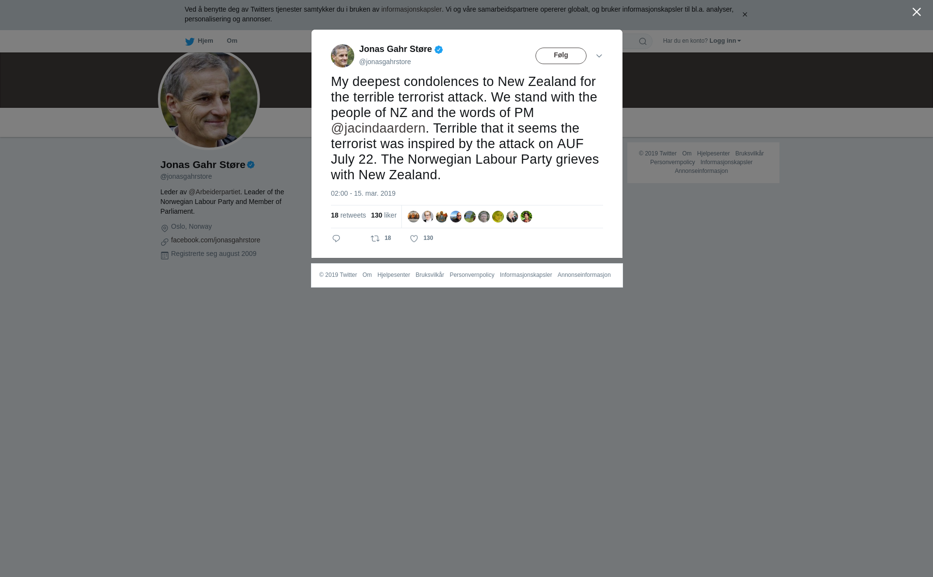My deepest condolences to New Zealand for the terrible terrorist attack. We stand with the people of NZ and the words of PM @jacindaardern. Terrible that it seems the terrorist was inspired by the attack on AUF July 22. The Norwegian Labour Party grieves with New Zealand.