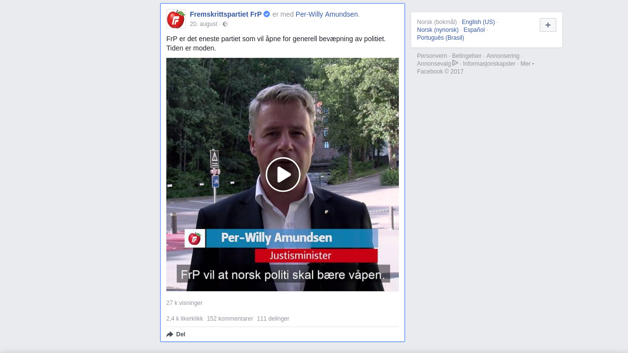 FrP er det eneste partiet som vil åpne for generell bevæpning av politiet. Tiden er moden.