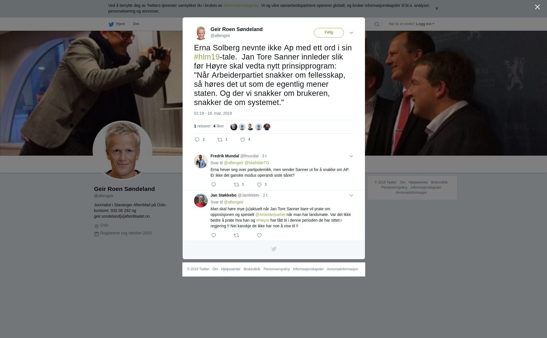 RT @aftengeir: Erna Solberg nevnte ikke Ap med ett ord i sin #hlm19-tale. Jan Tore Sanner innleder slik før Høyre skal vedta nytt prinsipprogram: "Når Arbeiderpartiet snakker om fellesskap, så høres det ut som de egentlig mener staten. Og der vi snakker om brukeren, snakker de om systemet."