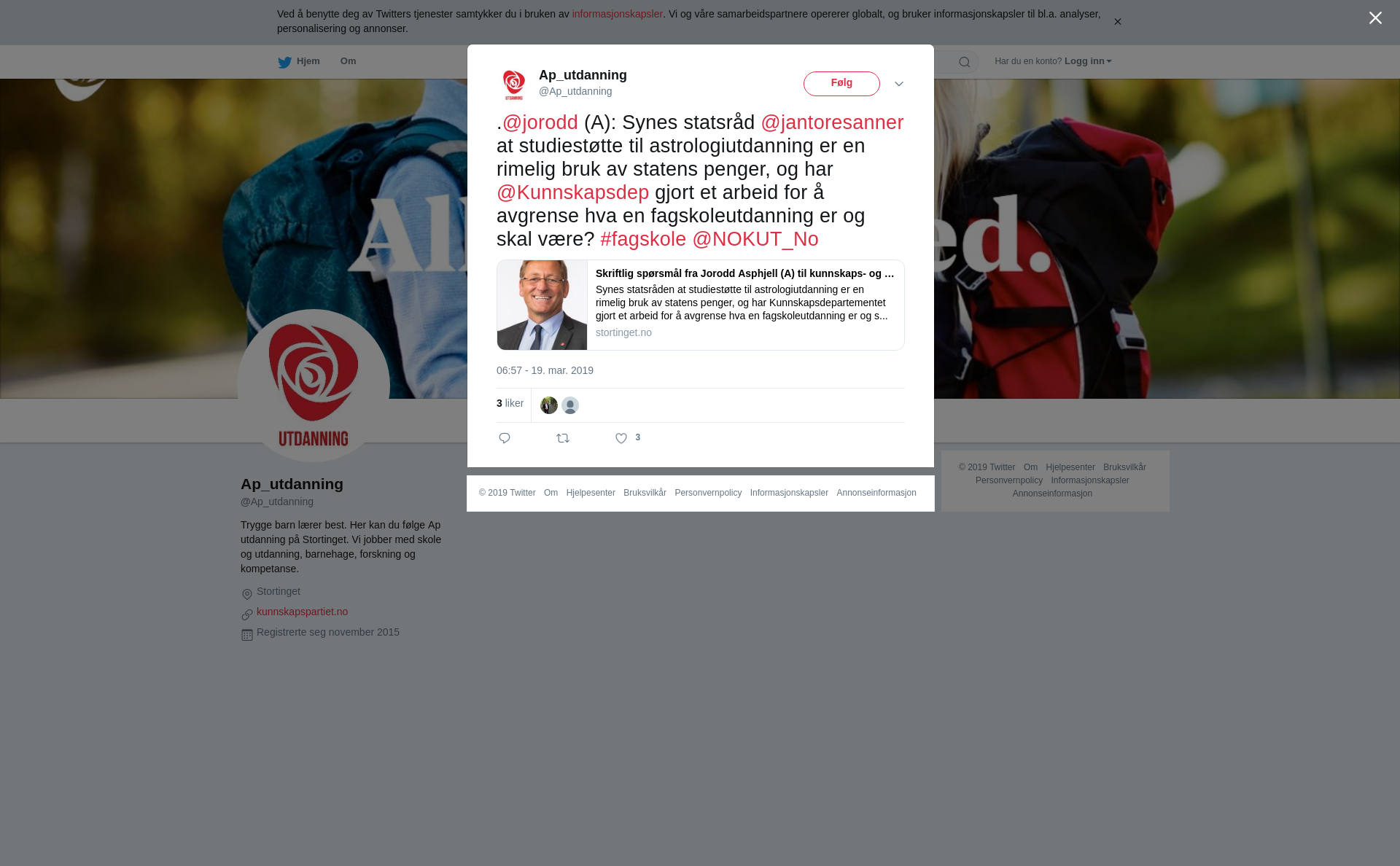 RT @Ap_utdanning: .@jorodd (A): Synes statsråd @jantoresanner at studiestøtte til astrologiutdanning er en rimelig bruk av statens penger, og har @Kunnskapsdep gjort et arbeid for å avgrense hva en fagskoleutdanning er og skal være? #fagskole @NOKUT_No https://t.co/c5qhmaJvOc