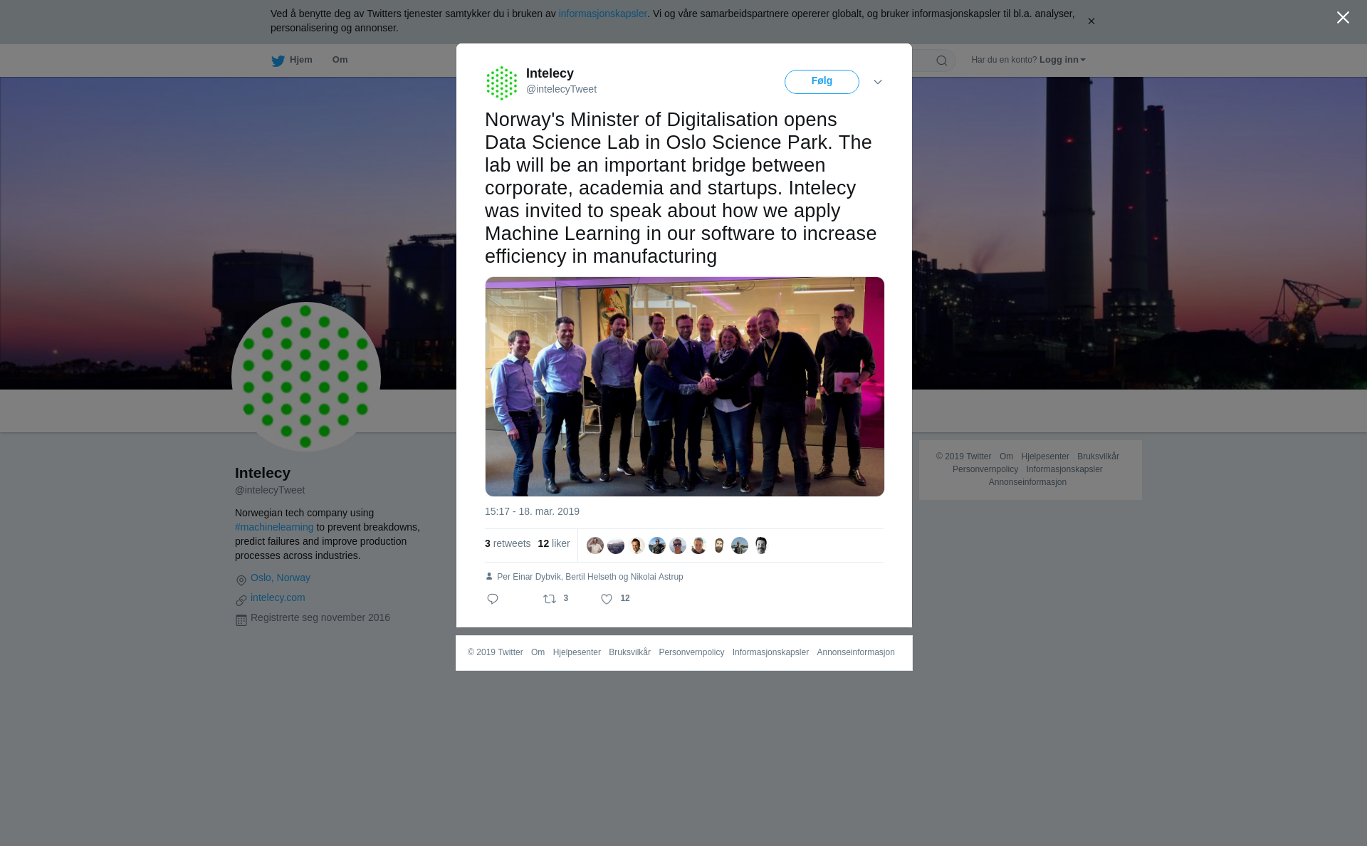 RT @intelecyTweet: Norway's Minister of Digitalisation opens Data Science Lab in Oslo Science Park. The lab will be an important bridge between corporate, academia and startups. Intelecy was invited to speak about how we apply Machine Learning in our software to increase efficiency in manufacturing https://t.co/CtZLOk1d1Q