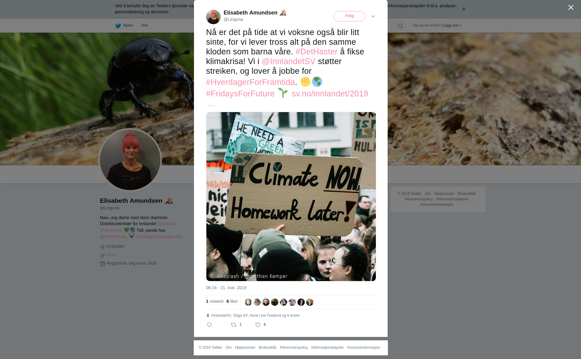 RT @Linguna: Nå er det på tide at vi voksne også blir litt sinte, for vi lever tross alt på den samme kloden som barna våre. #DetHaster å fikse klimakrisa! Vi i @InnlandetSV støtter streiken, og lover å jobbe for #HverdagerForFramtida. ✊🌎 #FridaysForFuture 🌱 https://t.co/KnKZHLlL1i https://t.co/FfSkzPqFpX