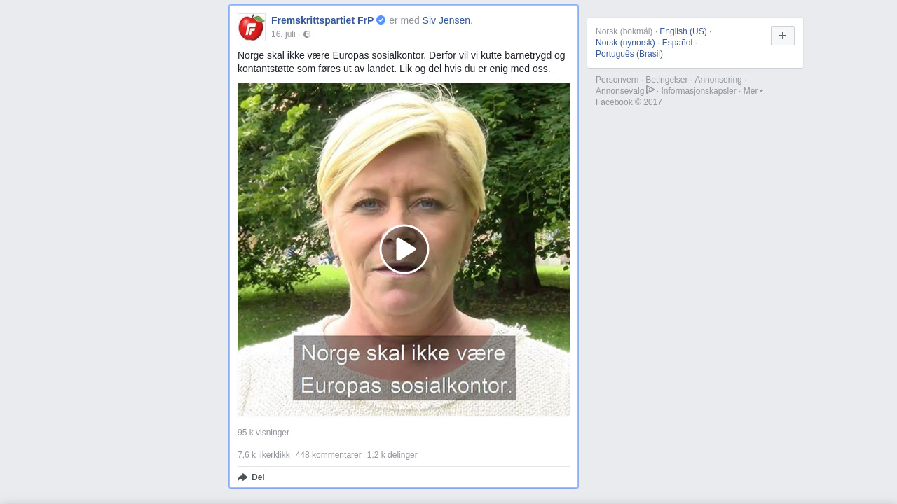 Norge skal ikke være Europas sosialkontor. Derfor vil vi kutte barnetrygd og kontantstøtte som føres ut av landet. Lik og del hvis du er enig med oss.