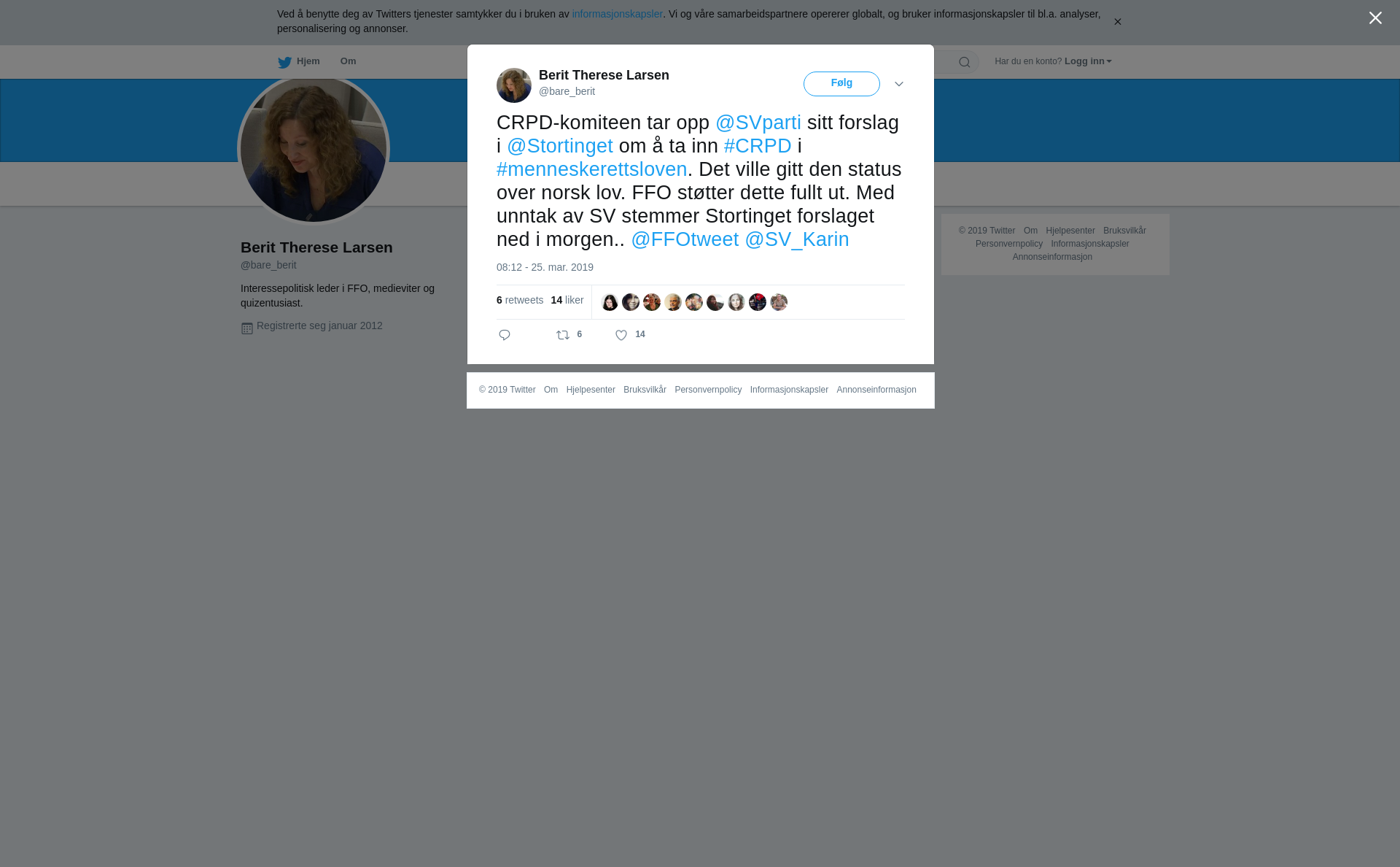 RT @bare_berit: CRPD-komiteen tar opp @SVparti sitt forslag i @Stortinget om å ta inn #CRPD i #menneskerettsloven. Det ville gitt den status over norsk lov. FFO støtter dette fullt ut. Med unntak av SV stemmer Stortinget forslaget ned i morgen.. @FFOtweet @SV_Karin