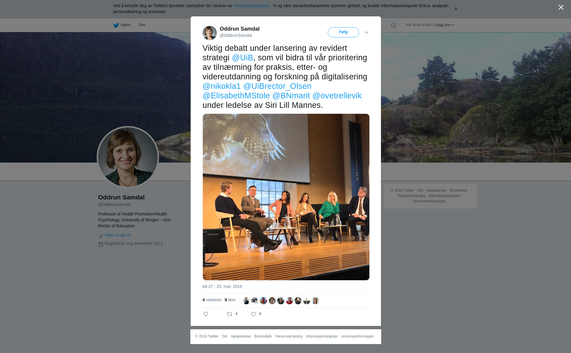 RT @OddrunSamdal: Viktig debatt under lansering av revidert strategi @UiB, som vil bidra til vår prioritering av tilnærming for praksis, etter- og videreutdanning og forskning på digitalisering @nikokla1 @UiBrector_Olsen @ElisabethMStole @BNmarit @ovetrellevik under ledelse av Siri Lill Mannes. https://t.co/XEpCUChHEC
