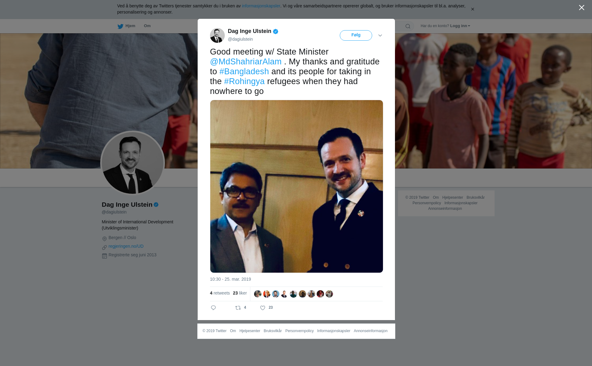 Good meeting w/ State Minister @MdShahriarAlam . My thanks and gratitude to #Bangladesh and its people for taking in the #Rohingya refugees when they had nowhere to go https://t.co/yUBMhCOjLv