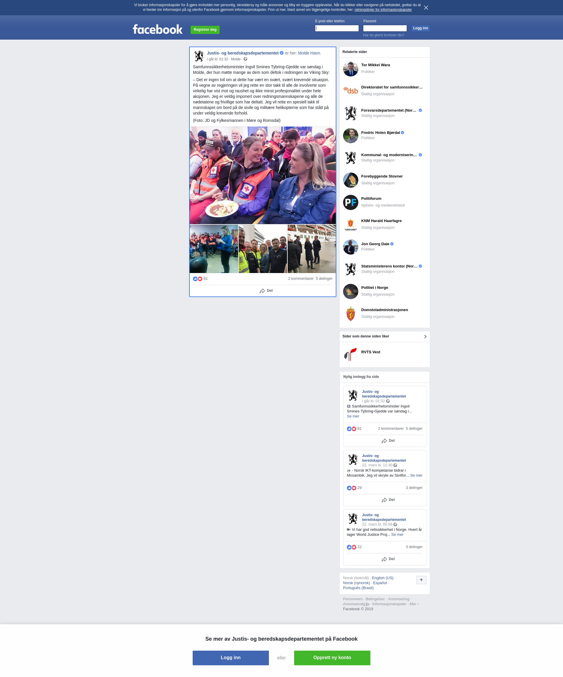 Samfunnssikkerhetsminister Ingvil Smines Tybring-Gjedde var søndag i Molde, der hun møtte mange av dem som deltok i redningen av Viking Sky: