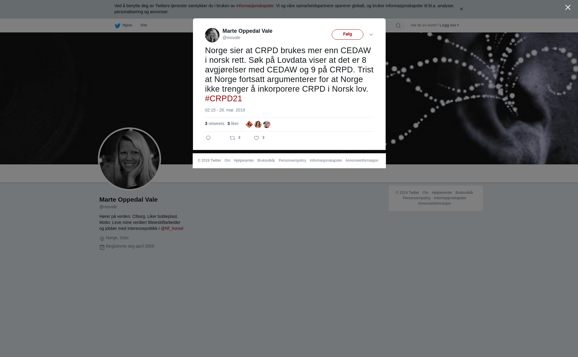 RT @movale: Norge sier at CRPD brukes mer enn CEDAW i norsk rett. Søk på Lovdata viser at det er 8 avgjørelser med CEDAW og 9 på CRPD. Trist at Norge fortsatt argumenterer for at Norge ikke trenger å inkorporere CRPD i Norsk lov. #CRPD21