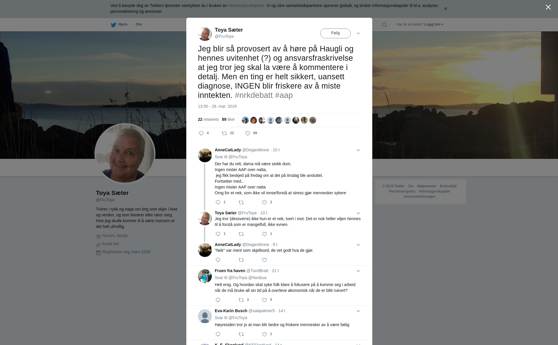RT @FruToya: Jeg blir så provosert av å høre på Haugli og hennes uvitenhet (?) og ansvarsfraskrivelse at jeg tror jeg skal la være å kommentere i detalj. Men en ting er helt sikkert, uansett diagnose, INGEN blir friskere av å miste inntekten. #nrkdebatt #aap
