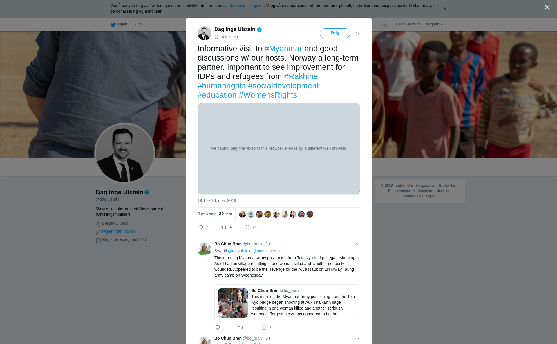 Informative visit to #Myanmar and good discussions w/ our hosts. Norway a long-term partner. Important to see improvement for IDPs and refugees from #Rakhine #humanrights #socialdevelopment #education #WomensRights https://t.co/5I0vfmW6DU