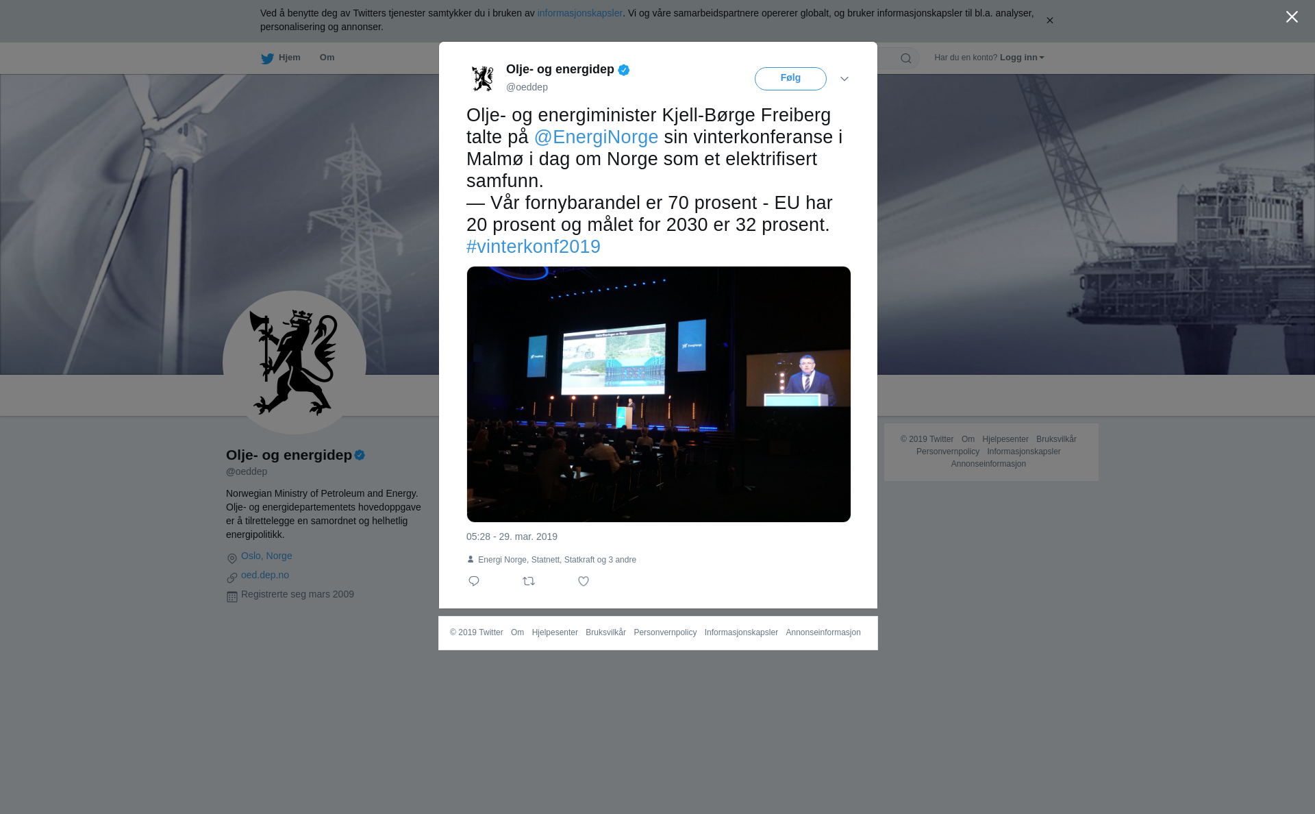 — Vår fornybarandel er 70 prosent - EU har 20 prosent og målet for 2030 er 32 prosent. #vinterkonf2019 https://t.co/D4V9g7Ip8A