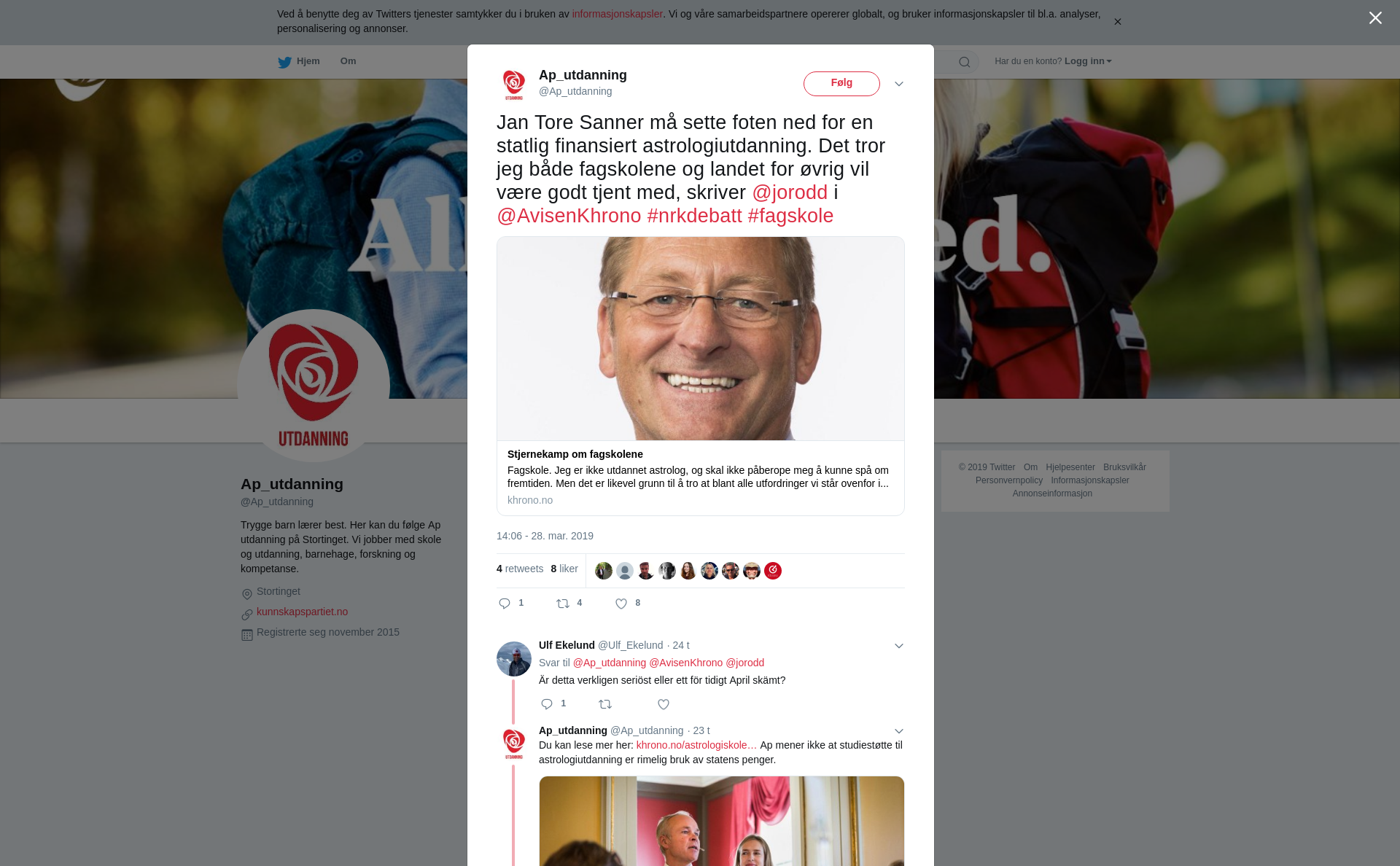 RT @Ap_utdanning: Jan Tore Sanner må sette foten ned for en statlig finansiert astrologiutdanning. Det tror jeg både fagskolene og landet for øvrig vil være godt tjent med, skriver @jorodd i @AvisenKhrono #nrkdebatt #fagskole https://t.co/DCXGb658IW