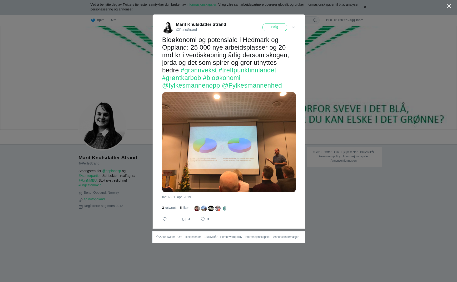 RT @PerleStrand: Bioøkonomi og potensiale i Hedmark og Oppland: 25 000 nye arbeidsplasser og 20 mrd kr i verdiskapning årlig dersom skogen, jorda og det som spirer og gror utnyttes bedre #grønnvekst #treffpunktinnlandet #grøntkarbob #bioøkonomi @fylkesmannenopp @Fylkesmannenhed https://t.co/4oqwnM7Zj1
