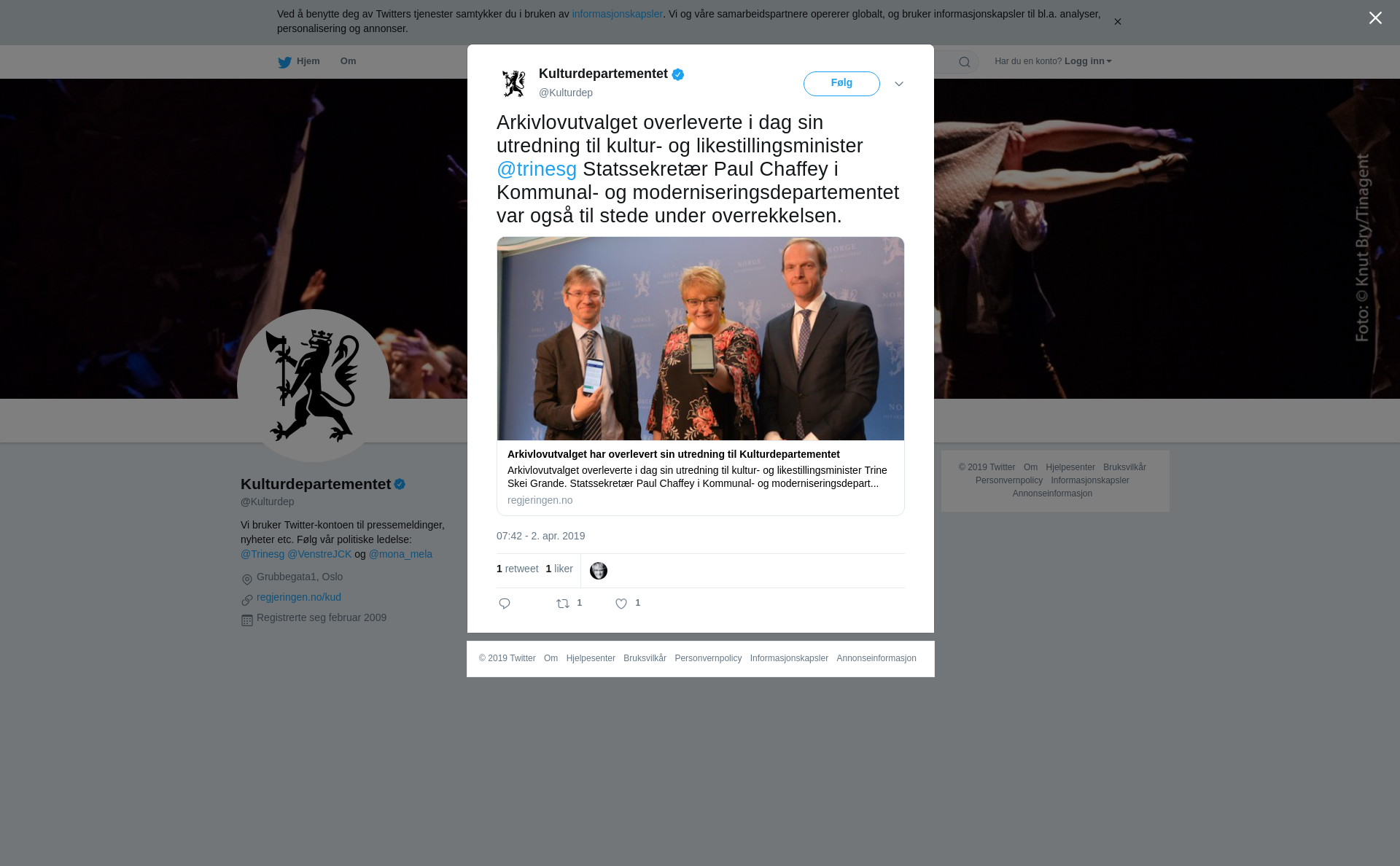 Arkivlovutvalget overleverte i dag sin utredning til kultur- og likestillingsminister Trine Skei Grande. Statssekretær Paul Chaffey i Kommunal- og moderniseringsdepartementet var til stede under overrekkelsen.