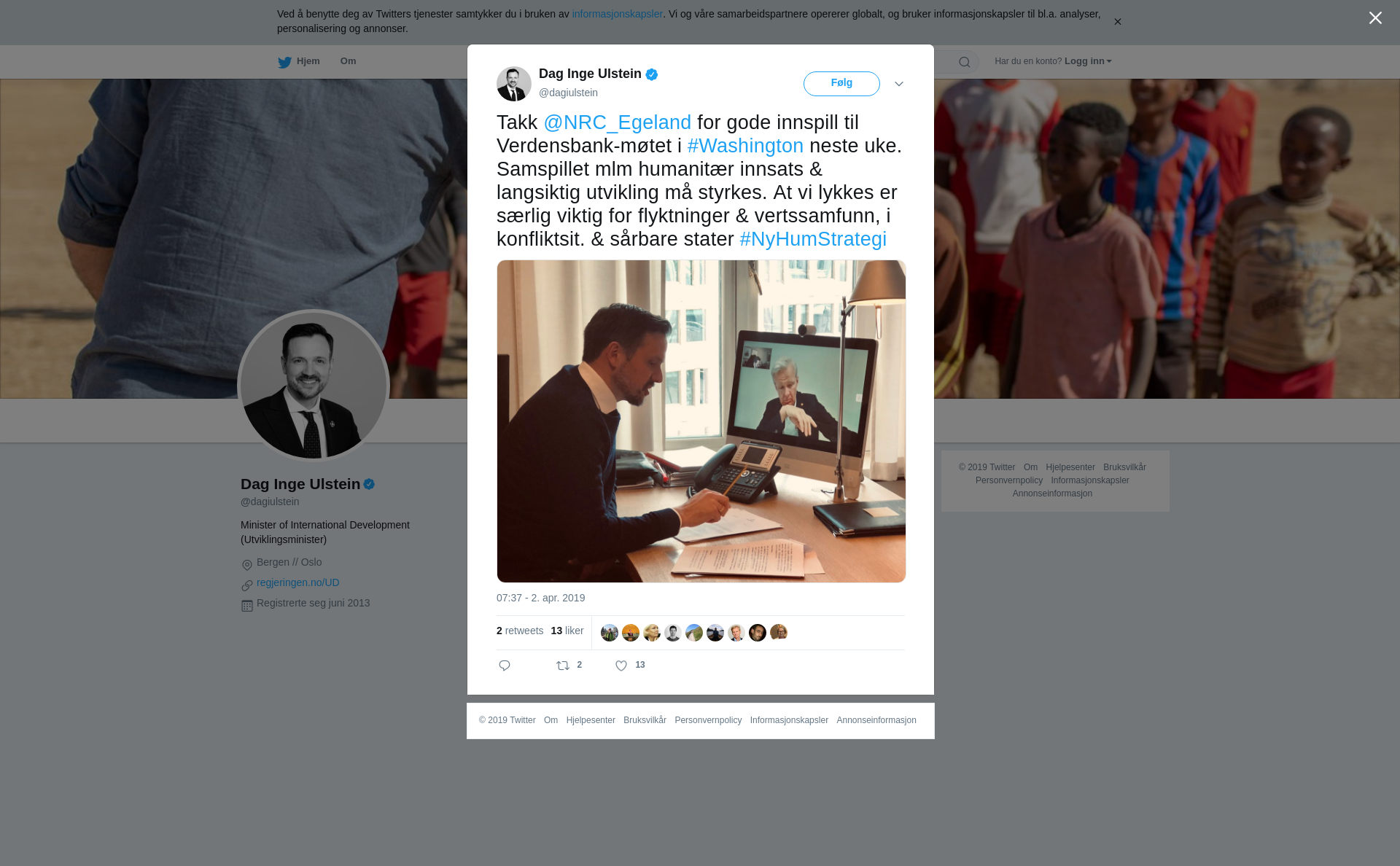 Takk @NRC_Egeland for gode innspill til Verdensbank-møtet i #Washington neste uke. Samspillet mlm humanitær innsats & langsiktig utvikling må styrkes. At vi lykkes er særlig viktig for flyktninger & vertssamfunn, i konfliktsit. & sårbare stater #NyHumStrategi https://t.co/AmyZa3neVK
