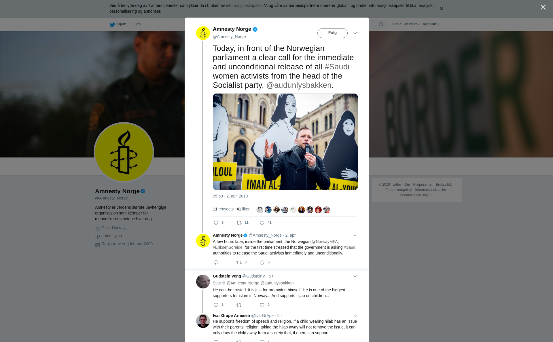 RT @Amnesty_Norge: Today, in front of the Norwegian parliament a clear call for the immediate and unconditional release of all #Saudi women activists from the head of the Socialist party, @audunlysbakken. https://t.co/6MXzmtVPMk