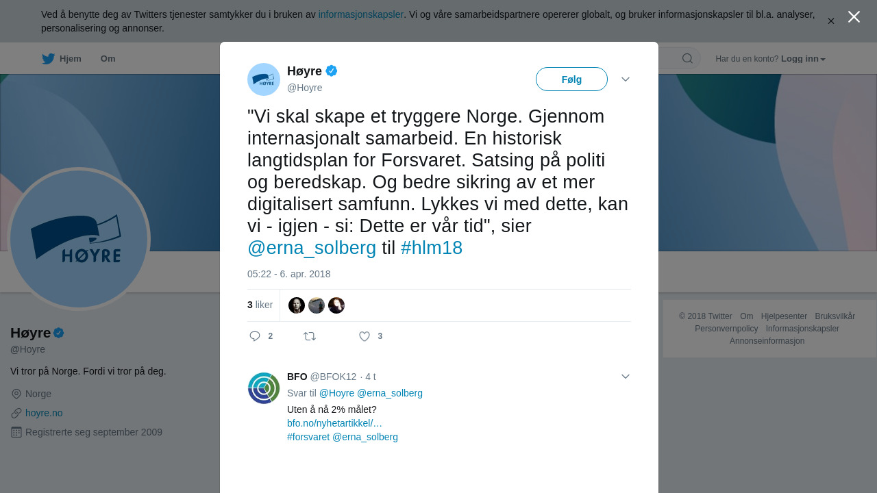"Vi skal skape et tryggere Norge. Gjennom internasjonalt samarbeid. En historisk langtidsplan for Forsvaret. Satsing på politi og beredskap. Og bedre sikring av et mer digitalisert samfunn. Lykkes vi med dette, kan vi - igjen - si: Dette er vår tid", sier @erna_solberg til #hlm18