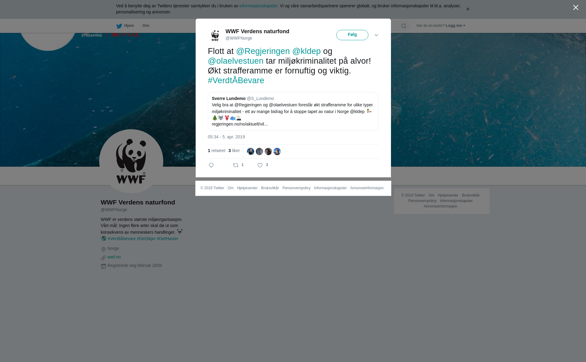 RT @WWFNorge: Flott at @Regjeringen @kldep og @olaelvestuen tar miljøkriminalitet på alvor! Økt strafferamme er fornuftig og viktig. #VerdtÅBevare https://t.co/NmnDDo8LE3