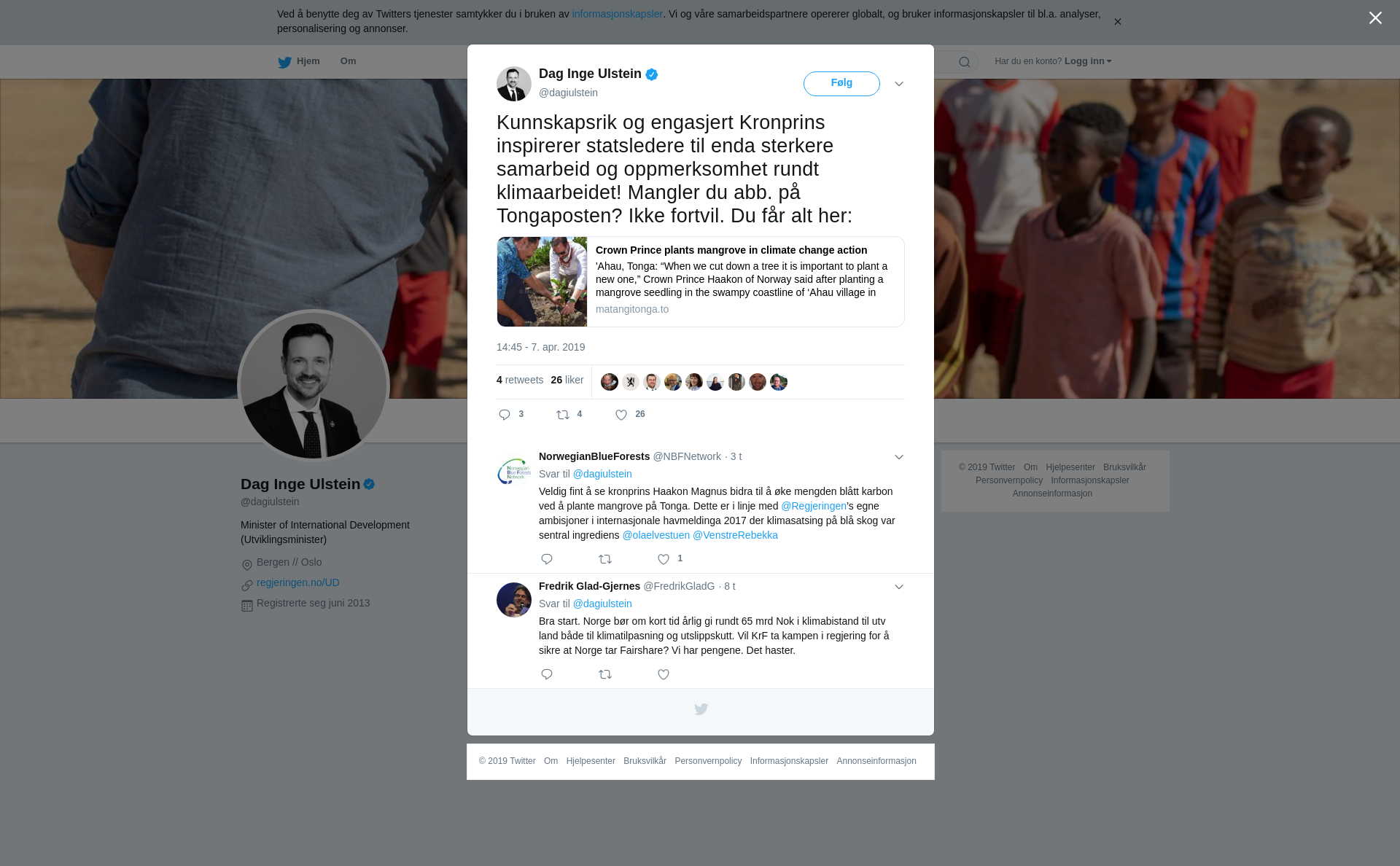 'Ahau, Tonga: “When we cut down a tree it is important to plant a new one,” Crown Prince Haakon of Norway said after planting a mangrove seedling in the swampy coastline of ‘Ahau village in Western Tongatapu today.