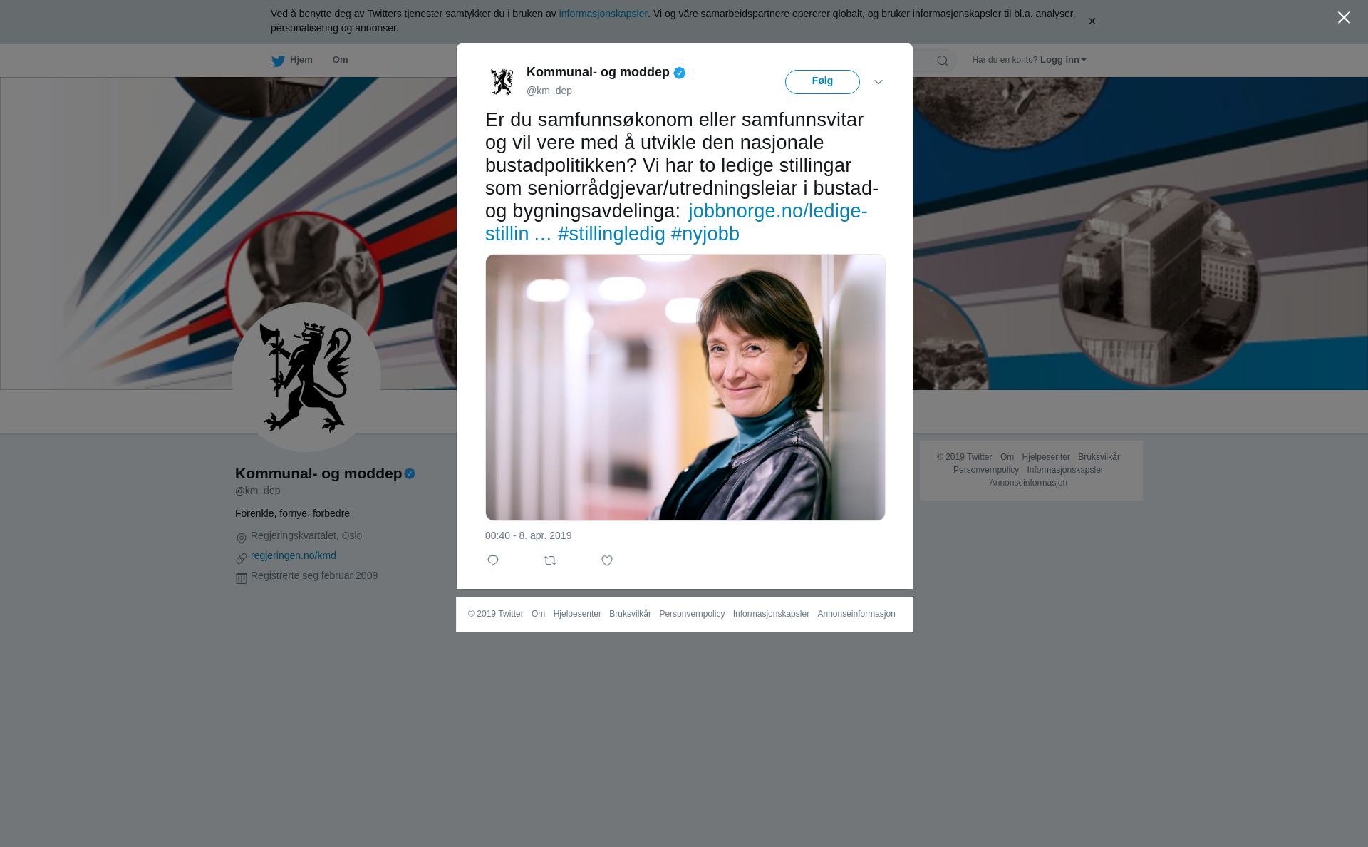 Stillingstittel: Seniorrådgiver/utredningsleder - 2 ledige stillinger (167021), Arbeidsgiver: Kommunal- og moderniseringsdepartementet, Søknadsfrist: 22. april 2019