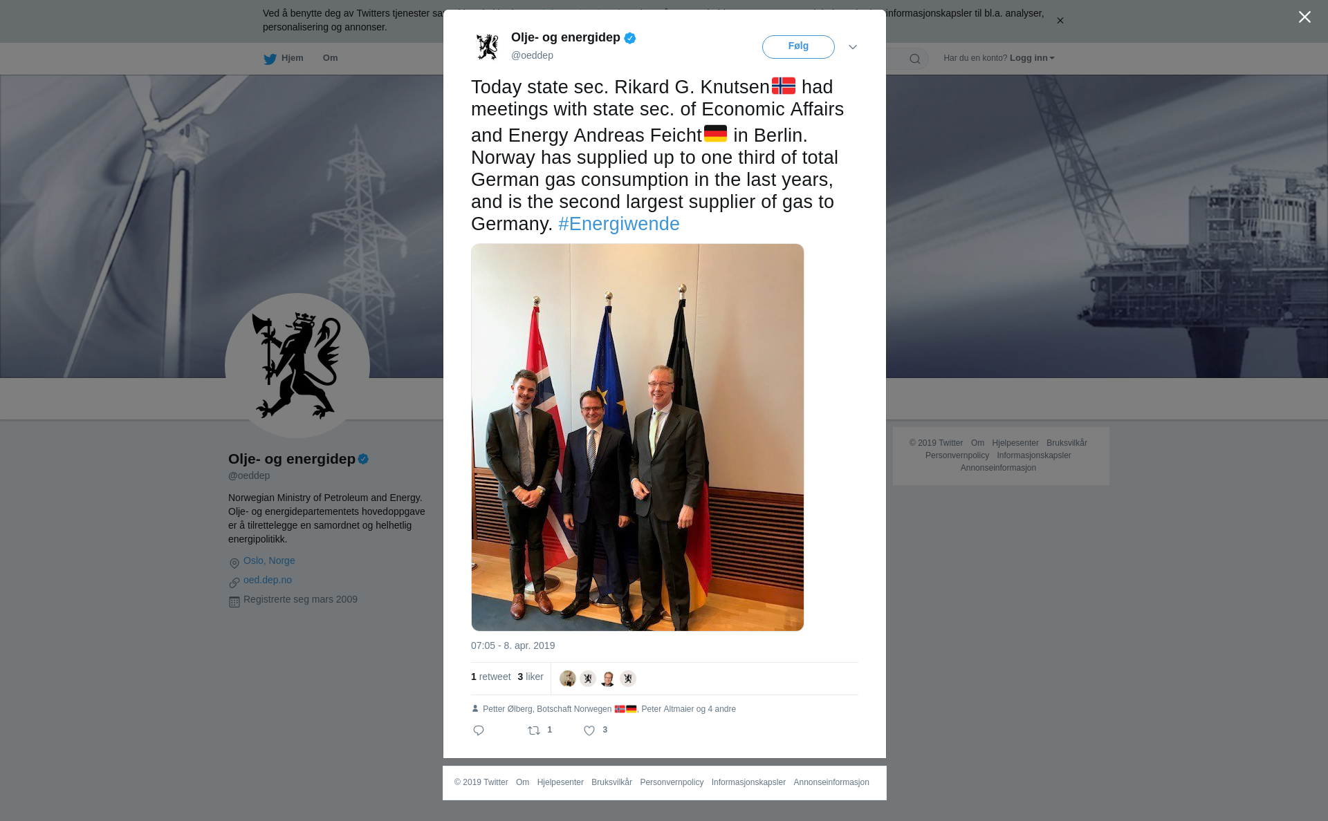 Today state sec. Rikard G. Knutsen🇳🇴 had meetings with state sec. of Economic Affairs and Energy Andreas Feicht🇩🇪 in Berlin. Norway has supplied up to one third of total German gas consumption in the last years, and is the second largest supplier of gas to Germany. #Energiwende https://t.co/xnWqQhdRdM