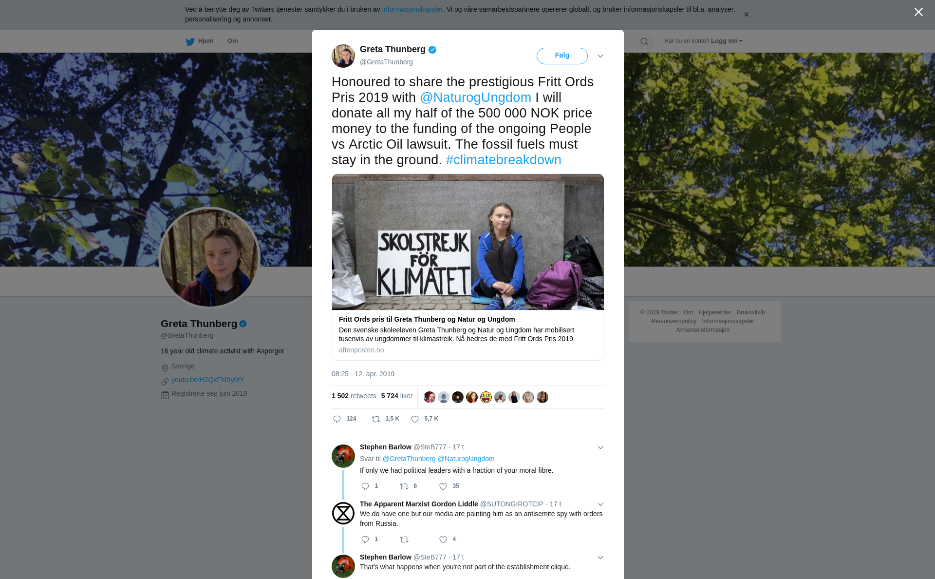 RT @GretaThunberg: Honoured to share the prestigious Fritt Ords Pris 2019 with @NaturogUngdom I will donate all my half of the 500 000 NOK price money to the funding of the ongoing People vs Arctic Oil lawsuit. The fossil fuels must stay in the ground. #climatebreakdown https://t.co/bKzF2Aki5G