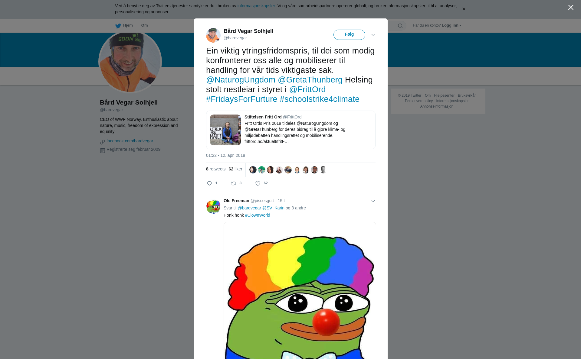 RT @bardvegar: Ein viktig ytringsfridomspris, til dei som modig konfronterer oss alle og mobiliserer til handling for vår tids viktigaste sak. @NaturogUngdom @GretaThunberg Helsing stolt nestleiar i styret i @FrittOrd #FridaysForFurture #schoolstrike4climate https://t.co/Vh6tYPu874