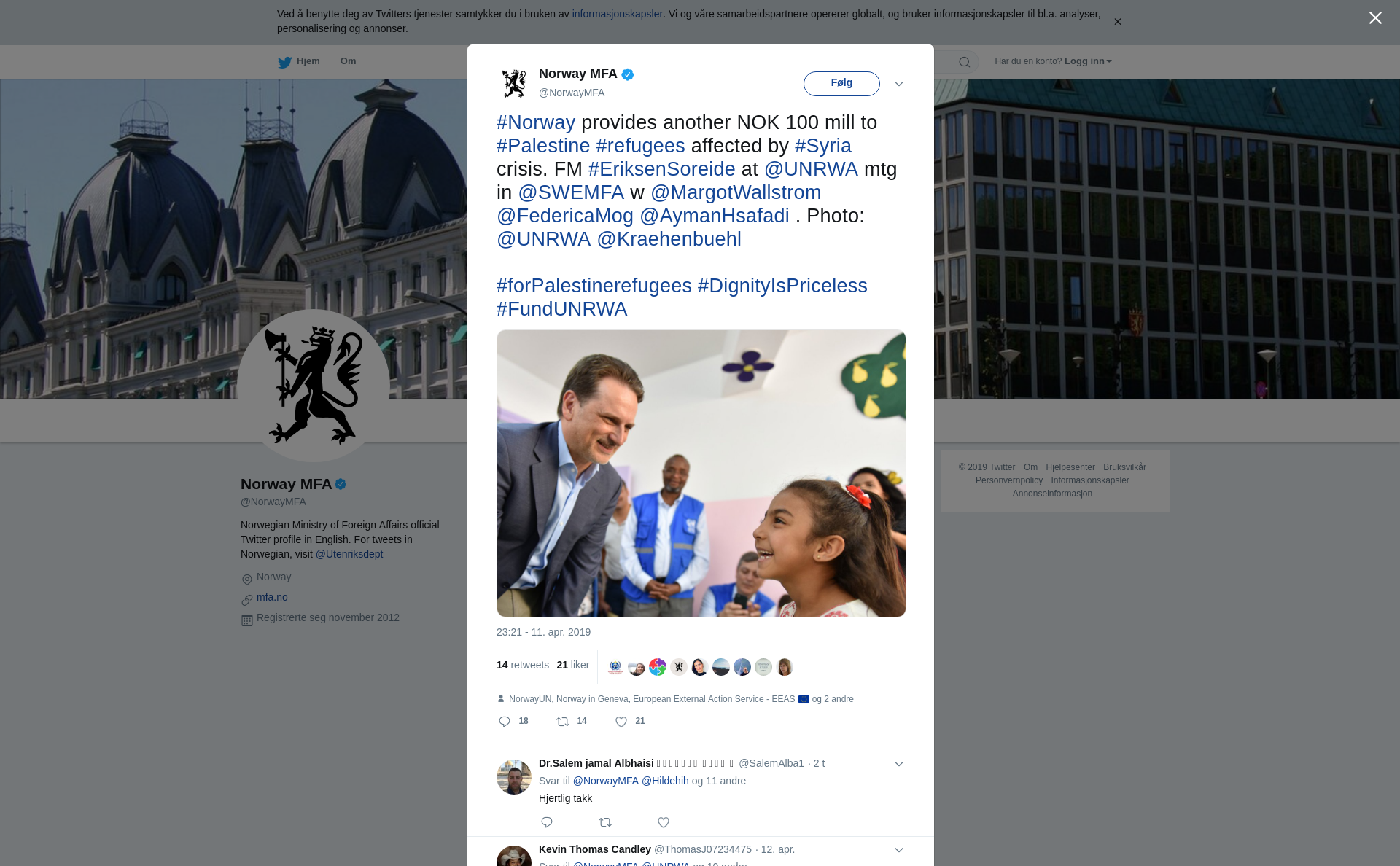 #Norway provides another NOK 100 mill to #Palestine #refugees affected by #Syria crisis. FM #EriksenSoreide at @UNRWA mtg in @SWEMFA w @MargotWallstrom @FedericaMog @AymanHsafadi . Photo: @UNRWA @Kraehenbuehl