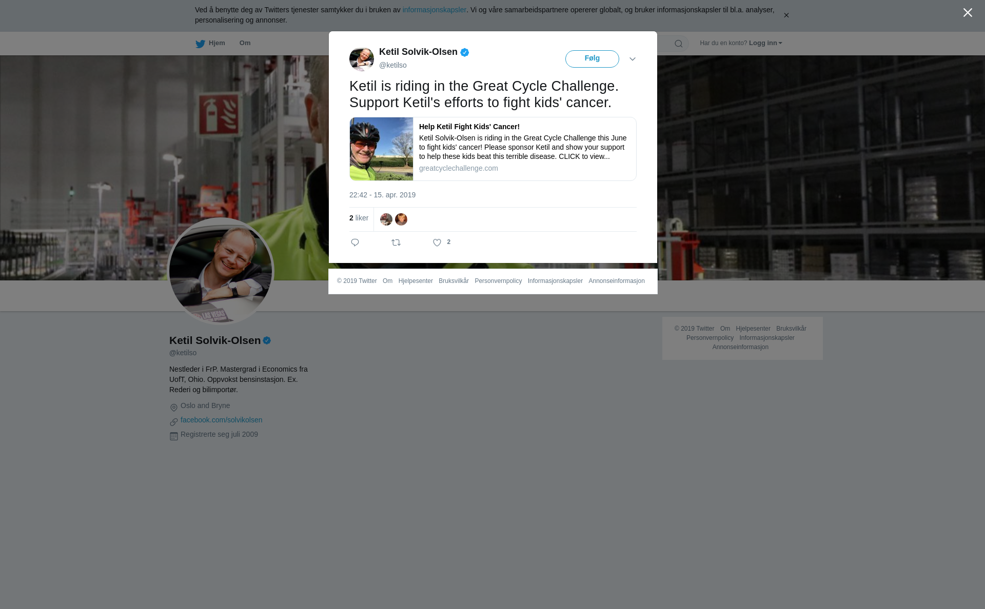 Ketil Solvik-Olsen is riding in the Great Cycle Challenge this June to fight kids' cancer! Please sponsor Ketil and show your support to help these kids beat this terrible disease. CLICK to view Ketil's fundraising page!