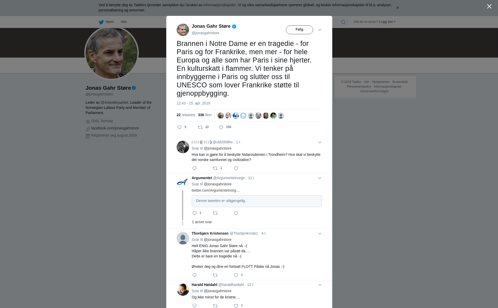 RT @jonasgahrstore: Brannen i Notre Dame er en tragedie - for Paris og for Frankrike, men mer - for hele Europa og alle som har Paris i sine hjerter. En kulturskatt i flammer. Vi tenker på innbyggerne i Paris og slutter oss til UNESCO som lover Frankrike støtte til gjenoppbygging.