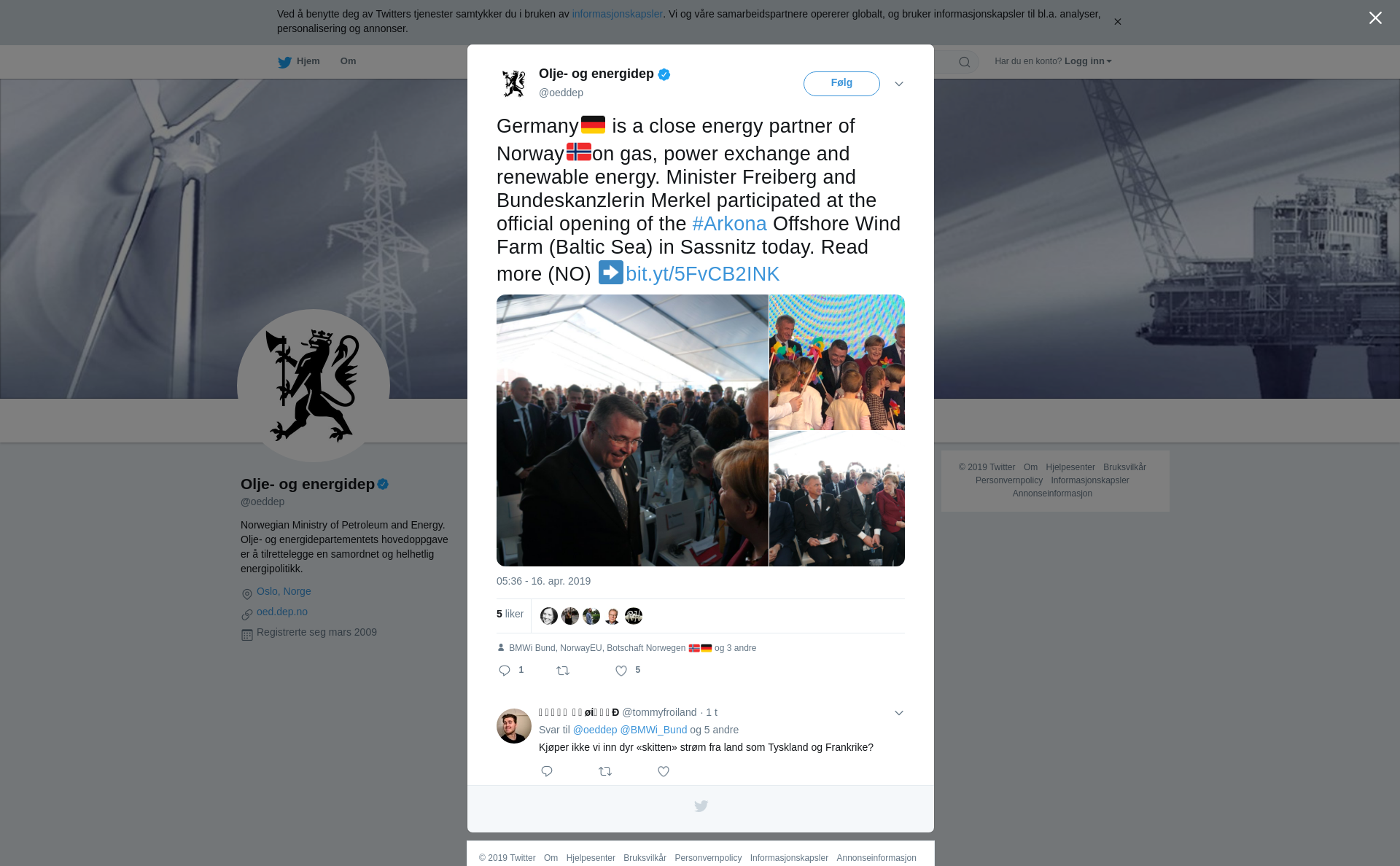 Germany🇩🇪 is a close energy partner of Norway🇳🇴on gas, power exchange and renewable energy. Minister Freiberg and Bundeskanzlerin Merkel participated at the official opening of the #Arkona Offshore Wind Farm (Baltic Sea) in Sassnitz today. Read more (NO) ➡️https://t.co/xCSVboaL6t https://t.co/e2e6W9rvIW