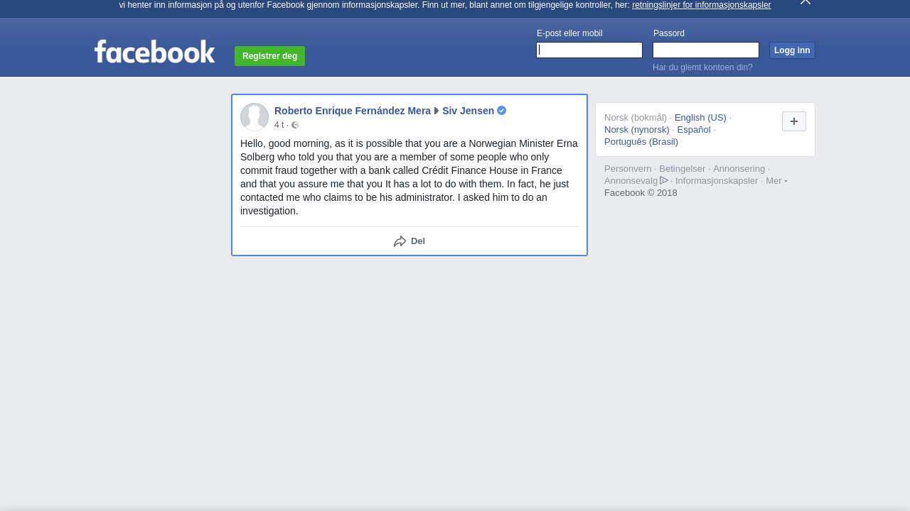Hello, good morning, as it is possible that you are a Norwegian Minister Erna Solberg who told you that you are a member of some people who only commit fraud together with a bank called Crédit Finance House in France and that you assure me that you It has a lot to do with them. In fact, he just contacted me who claims to be his administrator. I asked him to do an investigation.