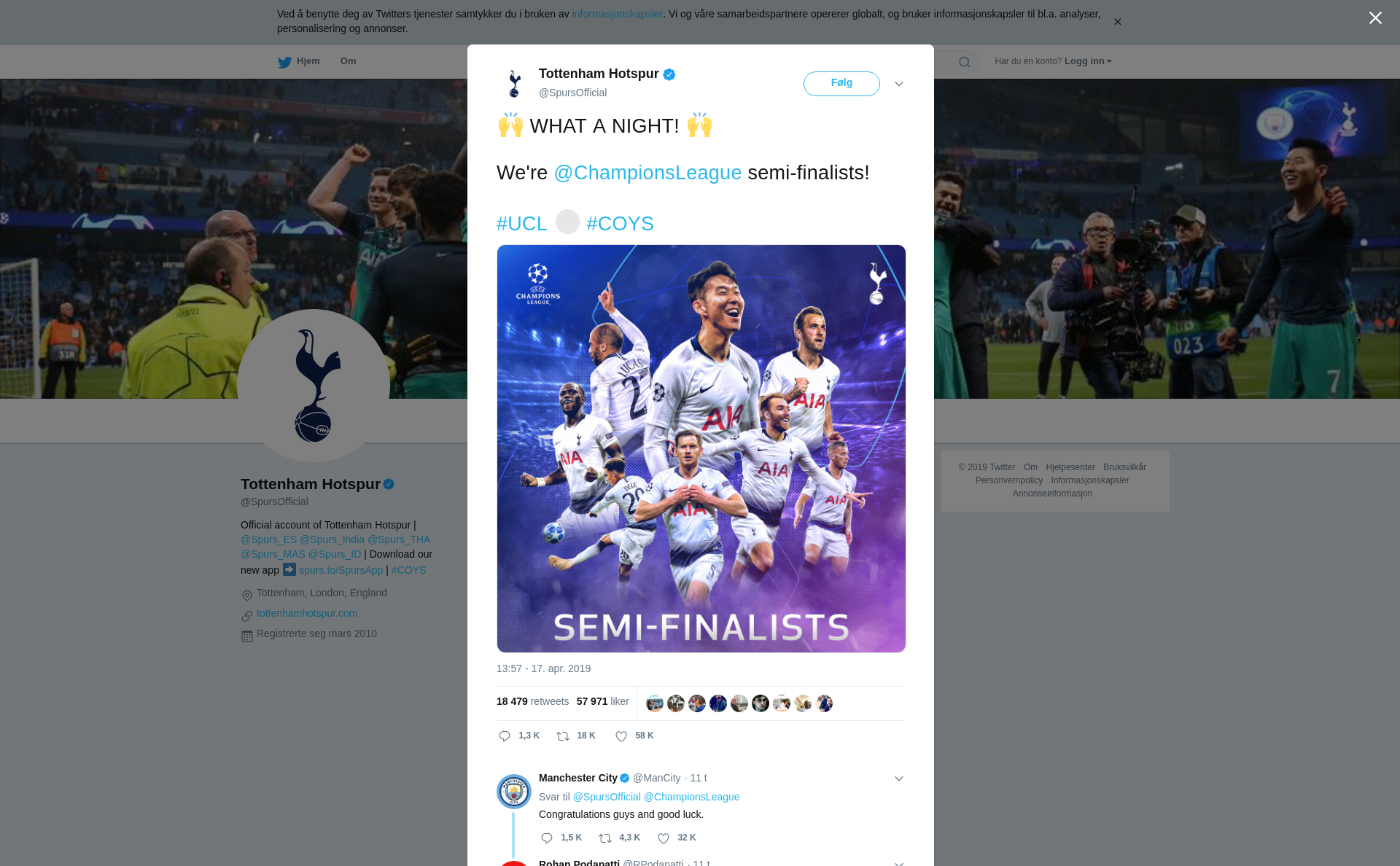 RT @SpursOfficial: 🙌 WHAT A NIGHT! 🙌 We're @ChampionsLeague semi-finalists! #UCL ⚪️ #COYS https://t.co/V90M3MY9KP