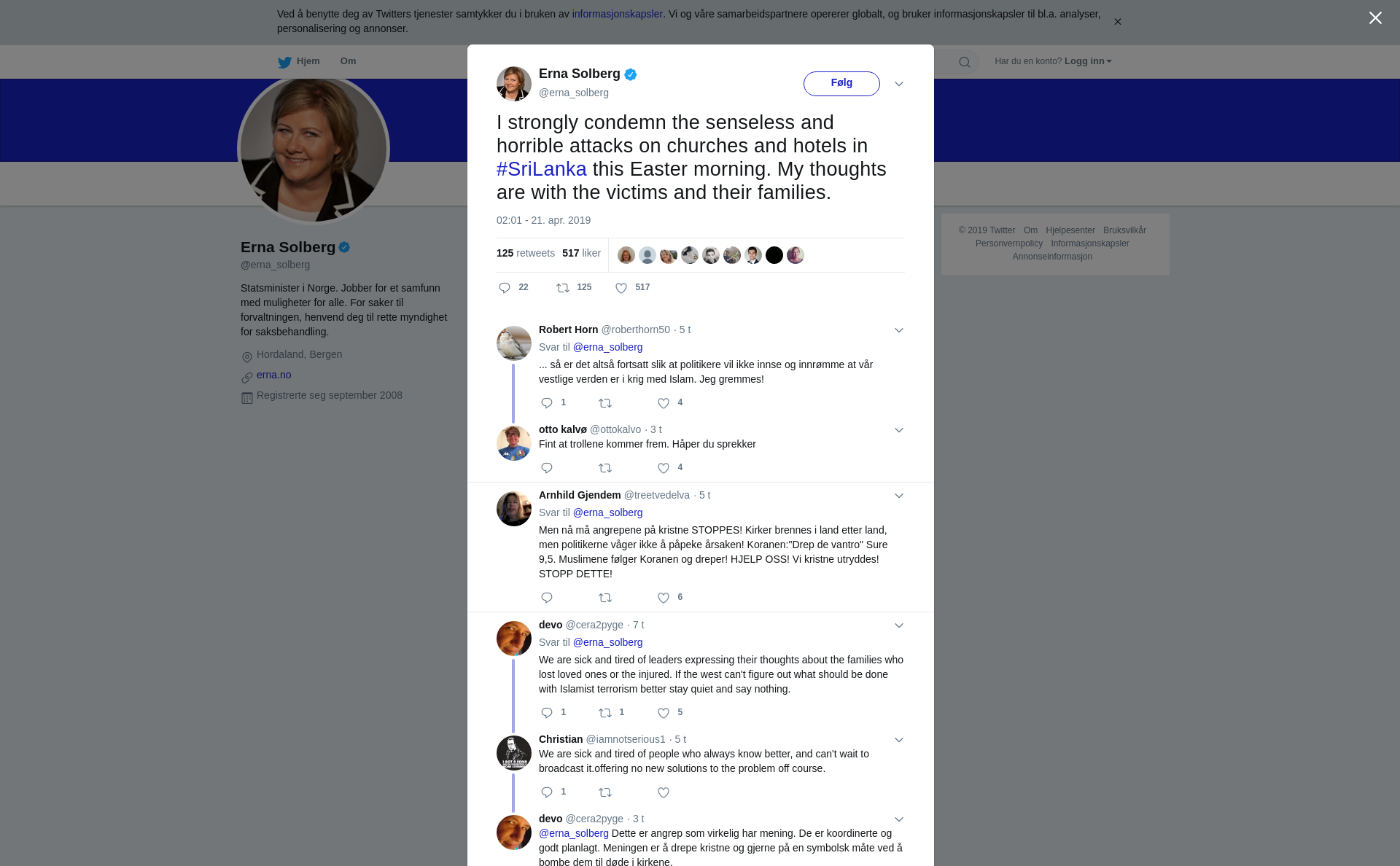 RT @erna_solberg: I strongly condemn the senseless and horrible attacks on churches and hotels in #SriLanka this Easter morning. My thoughts are with the victims and their families.