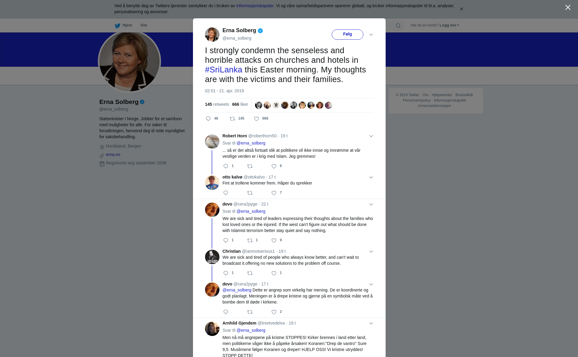 RT @erna_solberg: I strongly condemn the senseless and horrible attacks on churches and hotels in #SriLanka this Easter morning. My thoughts are with the victims and their families.