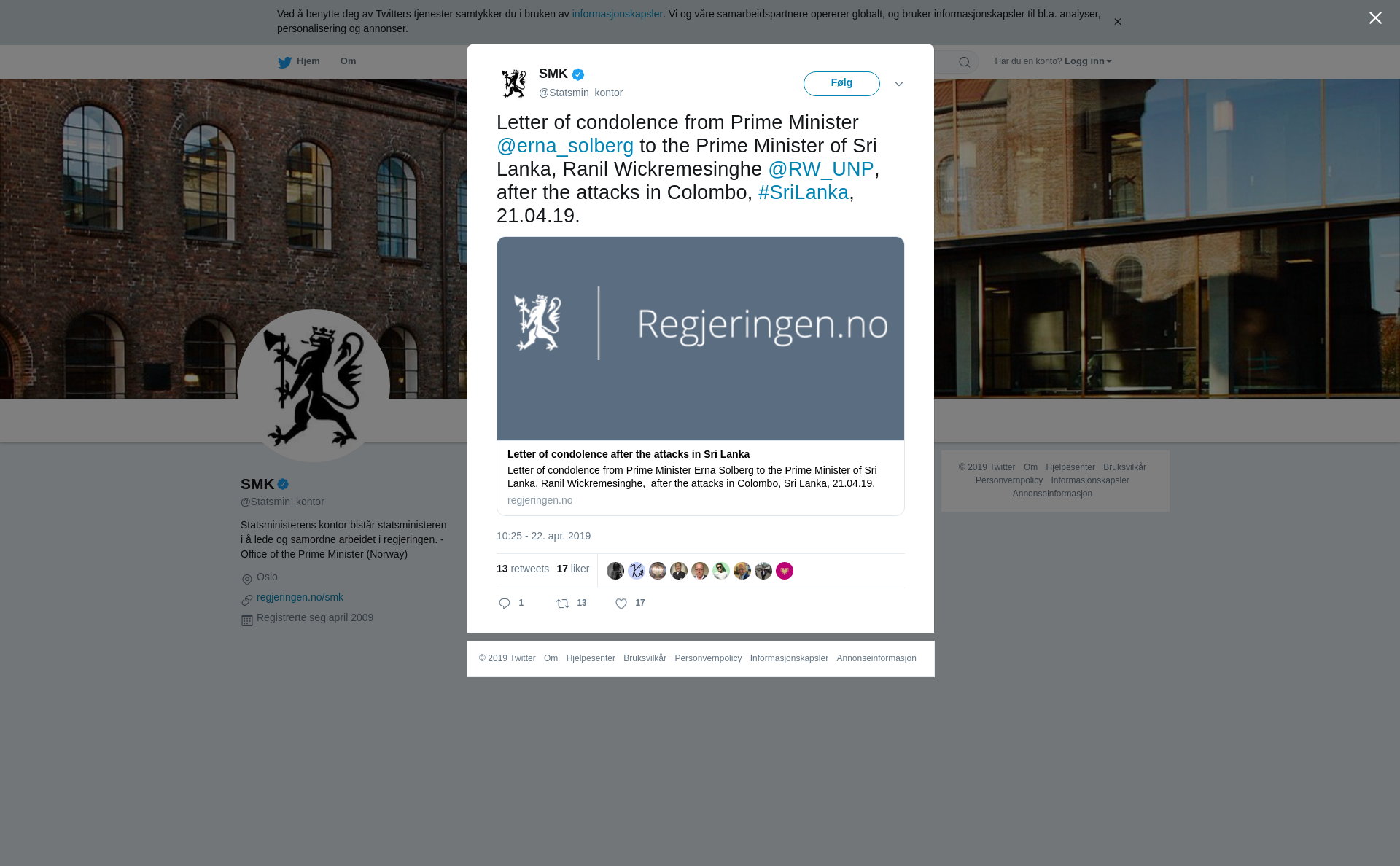 Letter of condolence from Prime Minister @erna_solberg to the Prime Minister of Sri Lanka, Ranil Wickremesinghe @RW_UNP, after the attacks in Colombo, #SriLanka, 21.04.19.