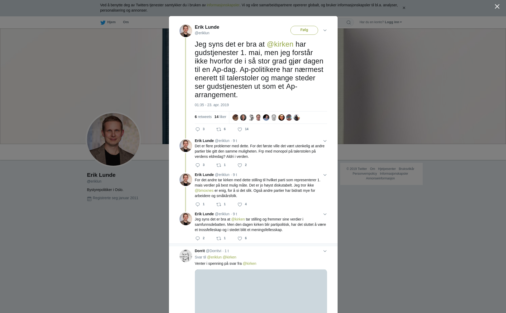 RT @eriklun: Jeg syns det er bra at @kirken har gudstjenester 1. mai, men jeg forstår ikke hvorfor de i så stor grad gjør dagen til en Ap-dag. Ap-politikere har nærmest enerett til talerstoler og mange steder ser gudstjenesten ut som et Ap-arrangement.