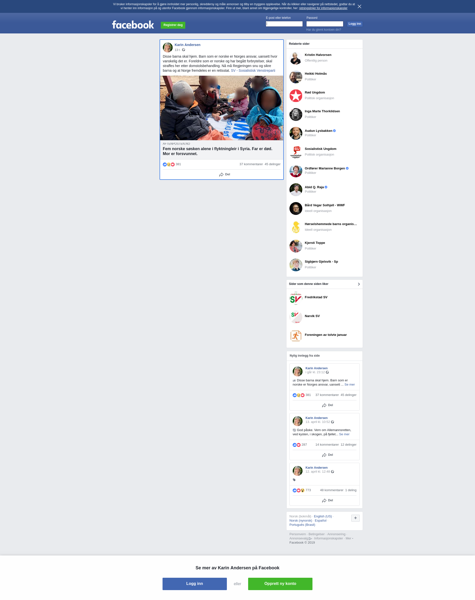 Disse barna skal hjem. Barn som er norske er Norges ansvar, uansett hvor vanskelig det er. Foreldre som er norske og har begått forbrytelser, skal straffes her etter domstolsbehandling. Nå må Regjeringen snu og sikre barna og at Norge fremdeles er en rettsstat. SV - Sosialistisk Venstreparti