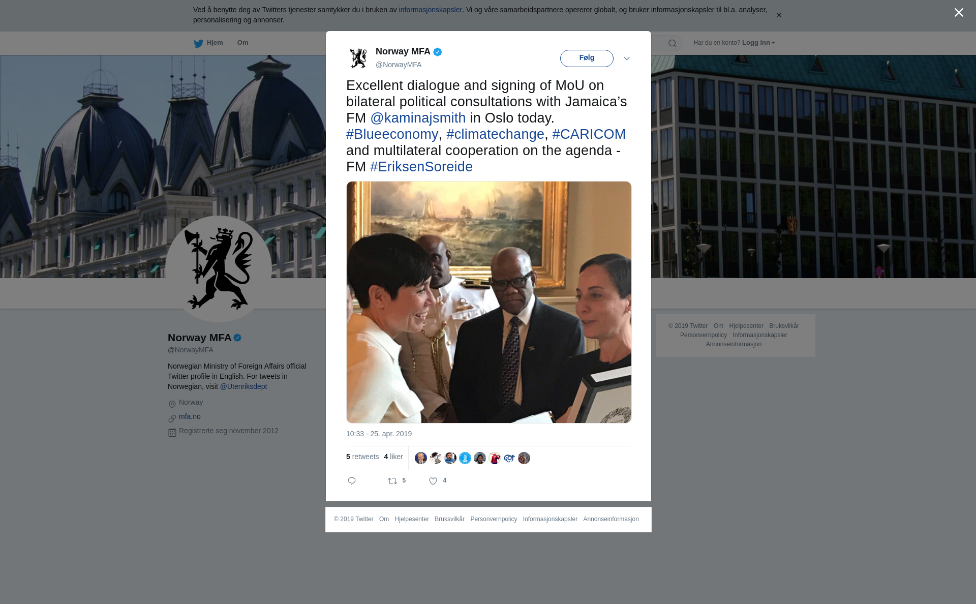 Excellent dialogue and signing of MoU on bilateral political consultations with Jamaica’s FM @kaminajsmith in Oslo today. #Blueeconomy, #climatechange, #CARICOM and multilateral cooperation on the agenda - FM #EriksenSoreide https://t.co/WP7l8Xcwyr
