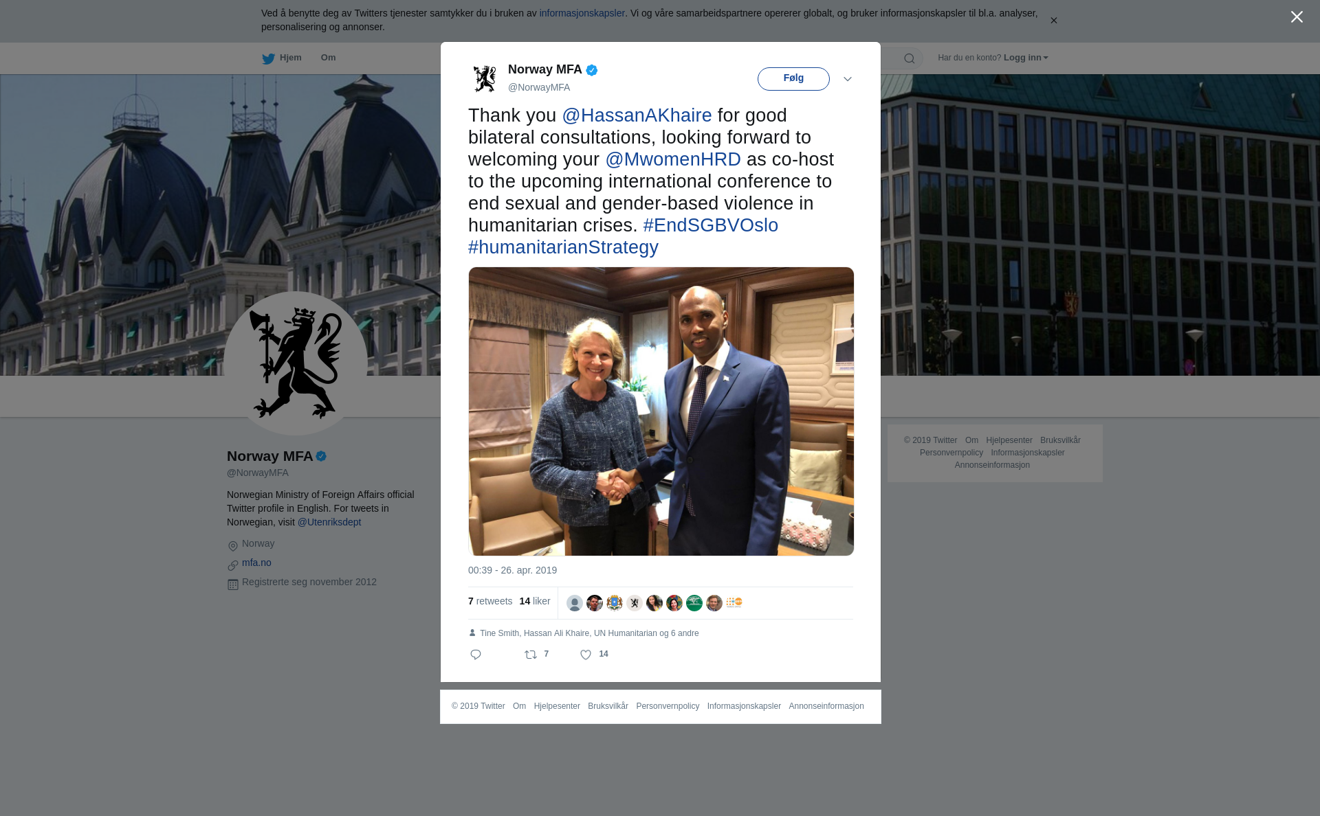 Thank you @HassanAKhaire for good bilateral consultations, looking forward to welcoming your @MwomenHRD as co-host to the upcoming international conference to end sexual and gender-based violence in humanitarian crises. #EndSGBVOslo #humanitarianStrategy https://t.co/VFR9BJK1Eo