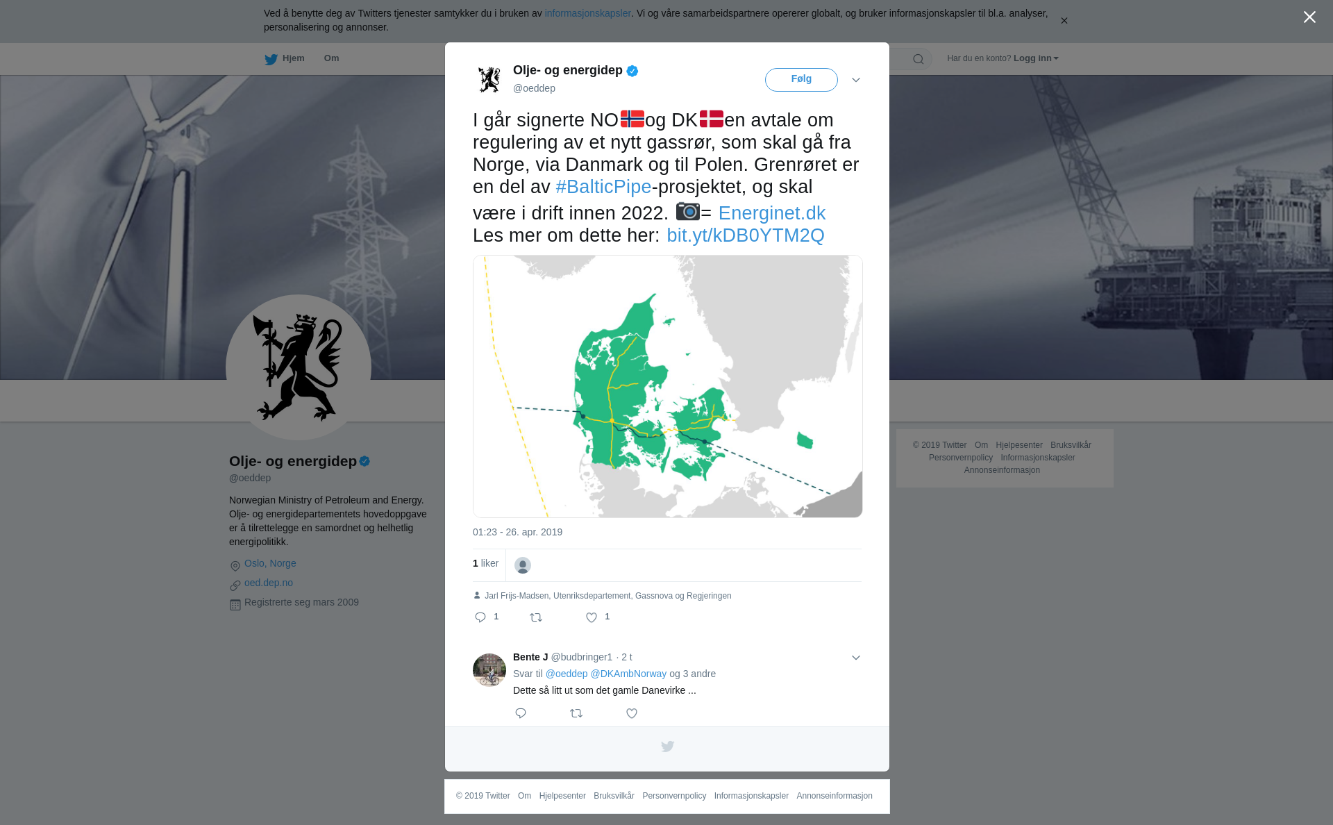 I går signerte NO🇳🇴og DK🇩🇰en avtale om regulering av et nytt gassrør, som skal gå fra Norge, via Danmark og til Polen. Grenrøret er en del av #BalticPipe-prosjektet, og skal være i drift innen 2022. 📷= https://t.co/KfN5ArPLQn