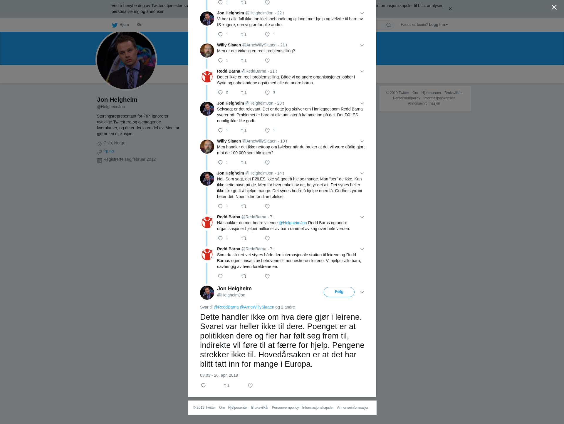 @ReddBarna @ArneWillySlaaen @BirgitteLange @aft_meninger Dette handler ikke om hva dere gjør i leirene. Svaret var heller ikke til dere. Poenget er at politikken dere og fler har følt seg frem til, indirekte vil føre til at færre for hjelp. Pengene strekker ikke til. Hovedårsaken er at det har blitt tatt inn for mange i Europa.