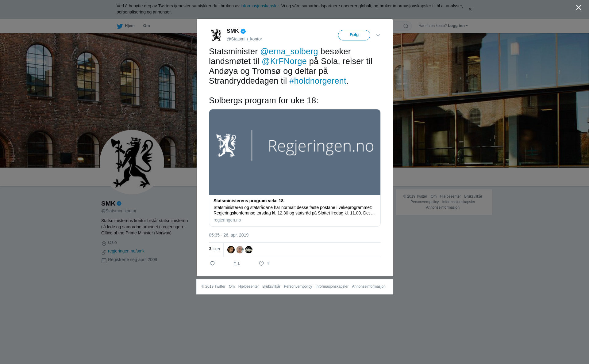 Statsministeren og statsrådane har normalt desse faste postane i vekeprogrammet: Regjeringskonferanse torsdag kl. 12.30 og statsråd på Slottet fredag kl. 11.00. Det er også jamlege møte i Regjeringa sitt sikkerheitsutval (RSU). Fredag 26. april Kl. 18....