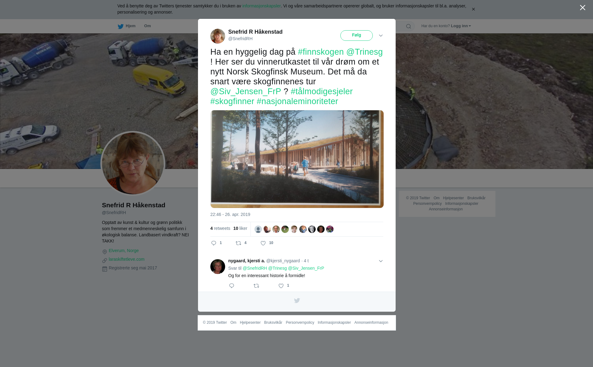 RT @SnefridRH: Ha en hyggelig dag på #finnskogen @Trinesg ! Her ser du vinnerutkastet til vår drøm om et nytt Norsk Skogfinsk Museum. Det må da snart være skogfinnenes tur @Siv_Jensen_FrP ? #tålmodigesjeler #skogfinner #nasjonaleminoriteter https://t.co/ZTlnb7M5Eu