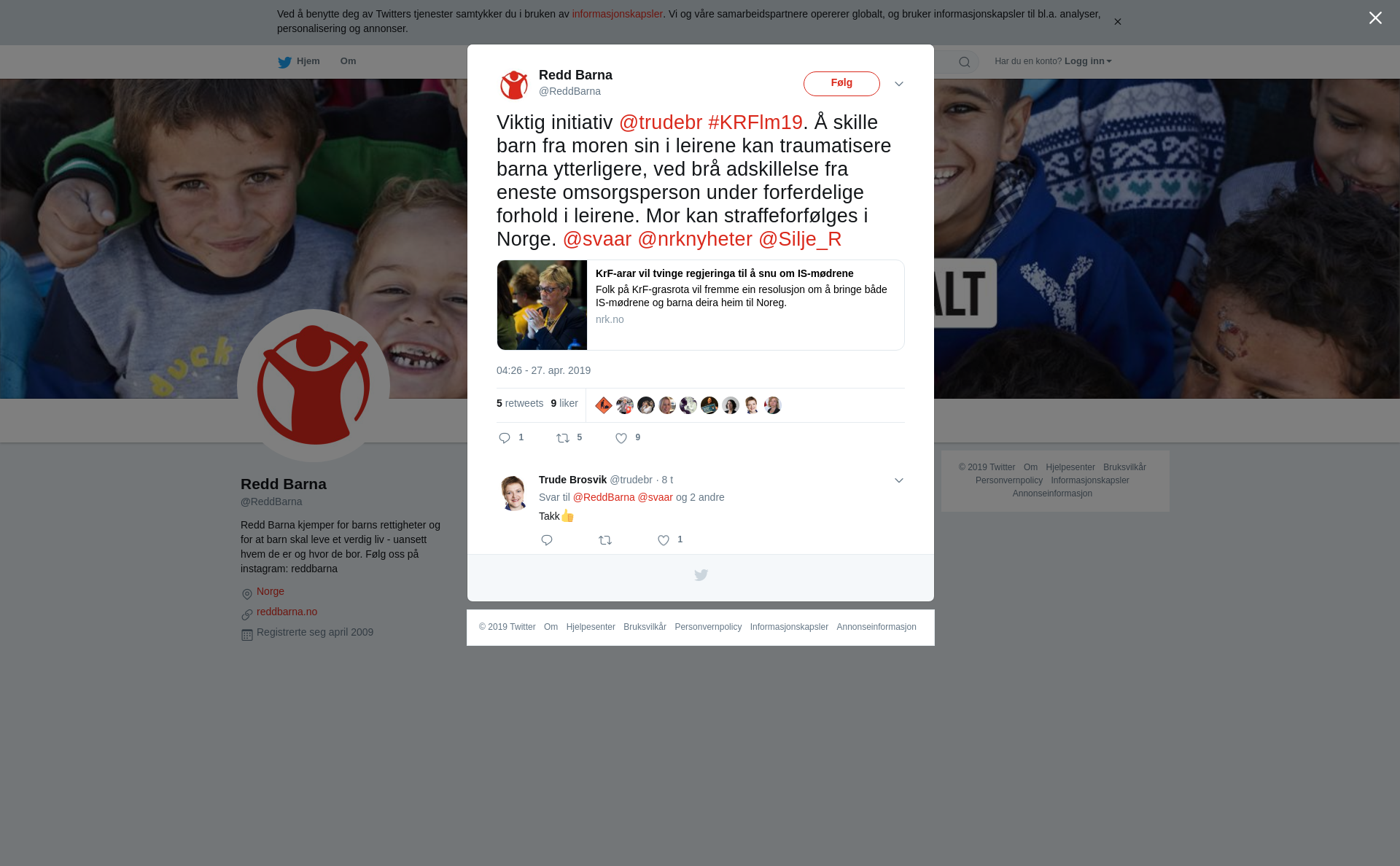 RT @ReddBarna: Viktig initiativ @trudebr #KRFlm19. Å skille barn fra moren sin i leirene kan traumatisere barna ytterligere, ved brå adskillelse fra eneste omsorgsperson under forferdelige forhold i leirene. Mor kan straffeforfølges i Norge. @svaar @nrknyheter @Silje_R https://t.co/ZwmemXmb2N