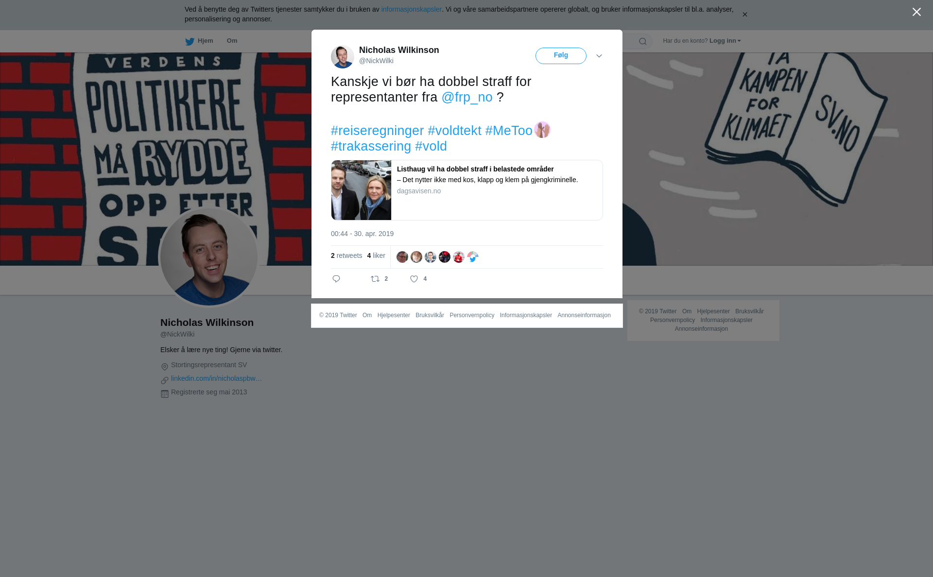 Kanskje vi bør ha dobbel straff for representanter fra @frp_no ? #reiseregninger #voldtekt #MeToo #trakassering #vold https://t.co/gEwgDo2MbU