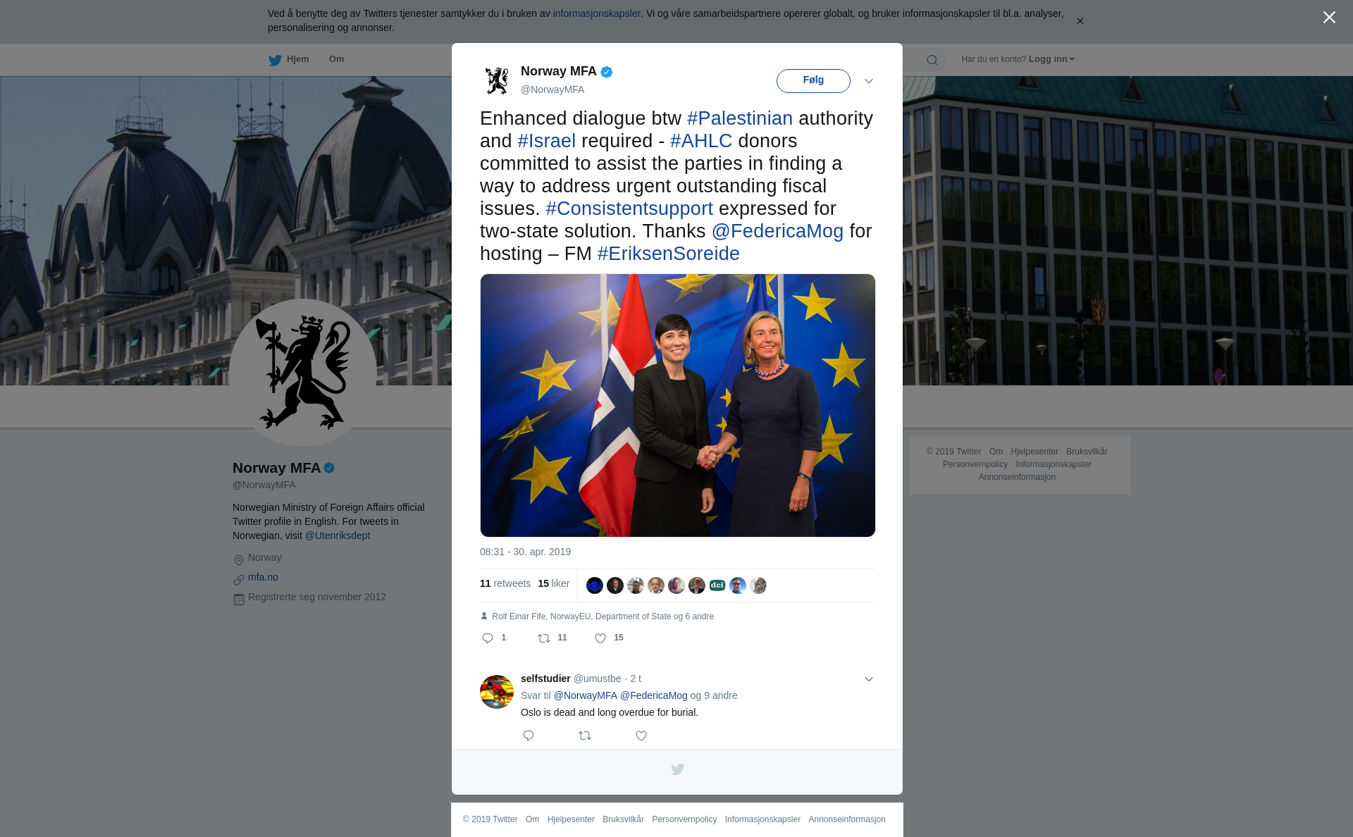 Enhanced dialogue btw #Palestinian authority and #Israel required - #AHLC donors committed to assist the parties in finding a way to address urgent outstanding fiscal issues. #Consistentsupport expressed for two-state solution. Thanks @FedericaMog for hosting – FM #EriksenSoreide https://t.co/YUMxPjRwxZ
